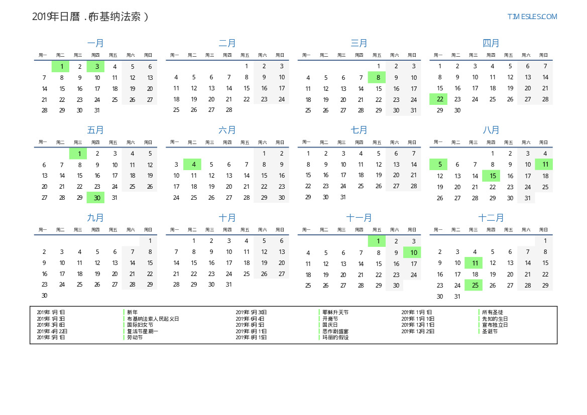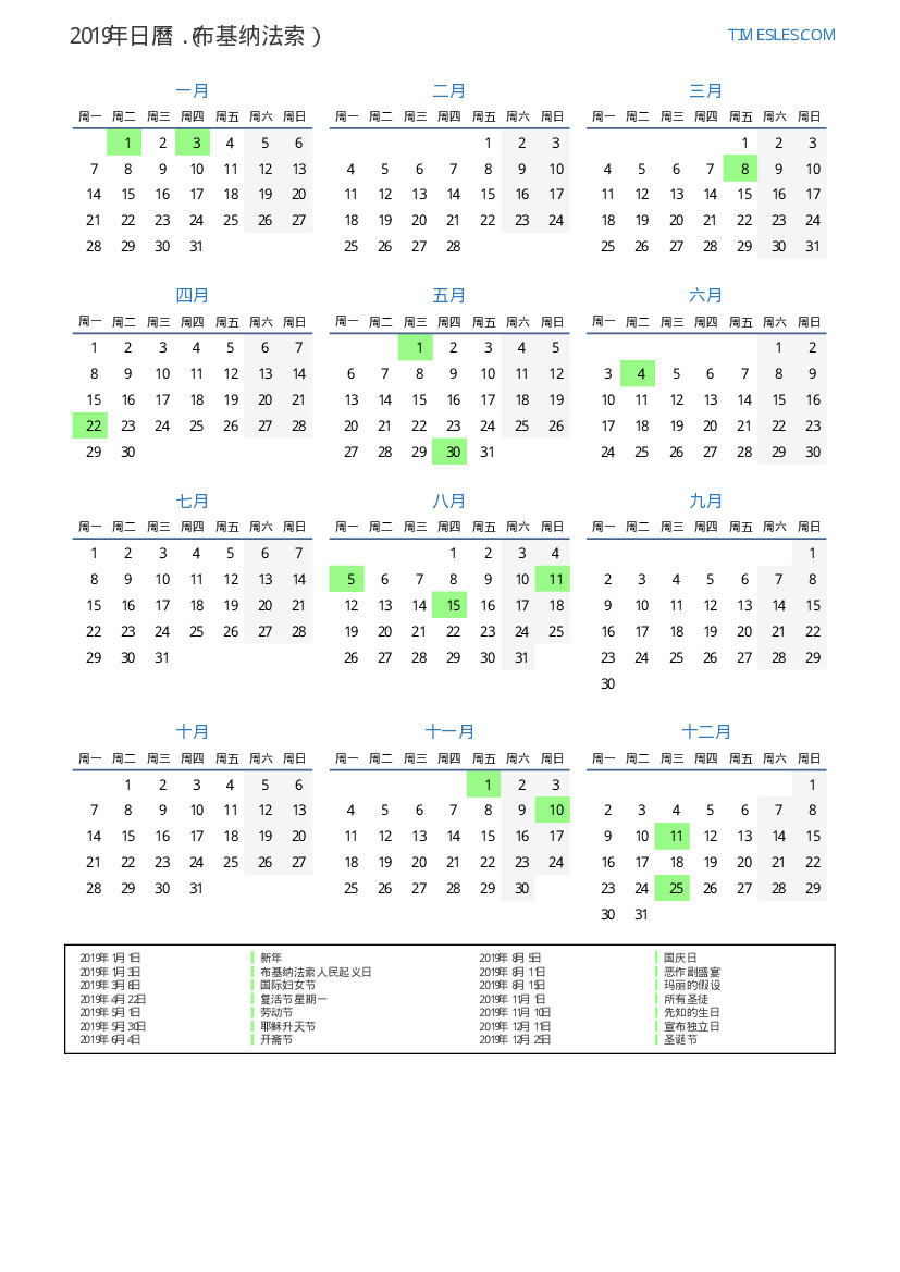 下載並打印2019年布基纳法索節假日和周末的PDF日曆