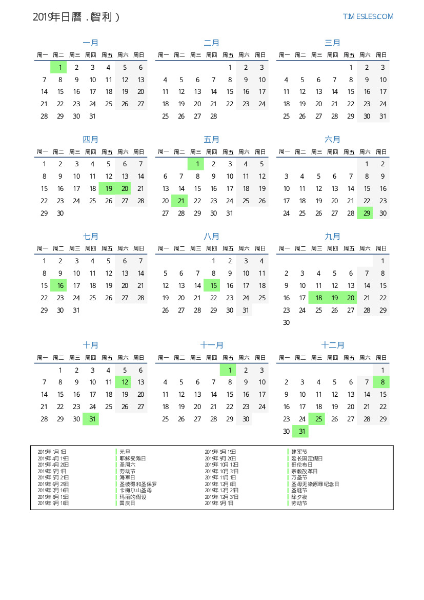 下載並打印2019年智利節假日和周末的PDF日曆