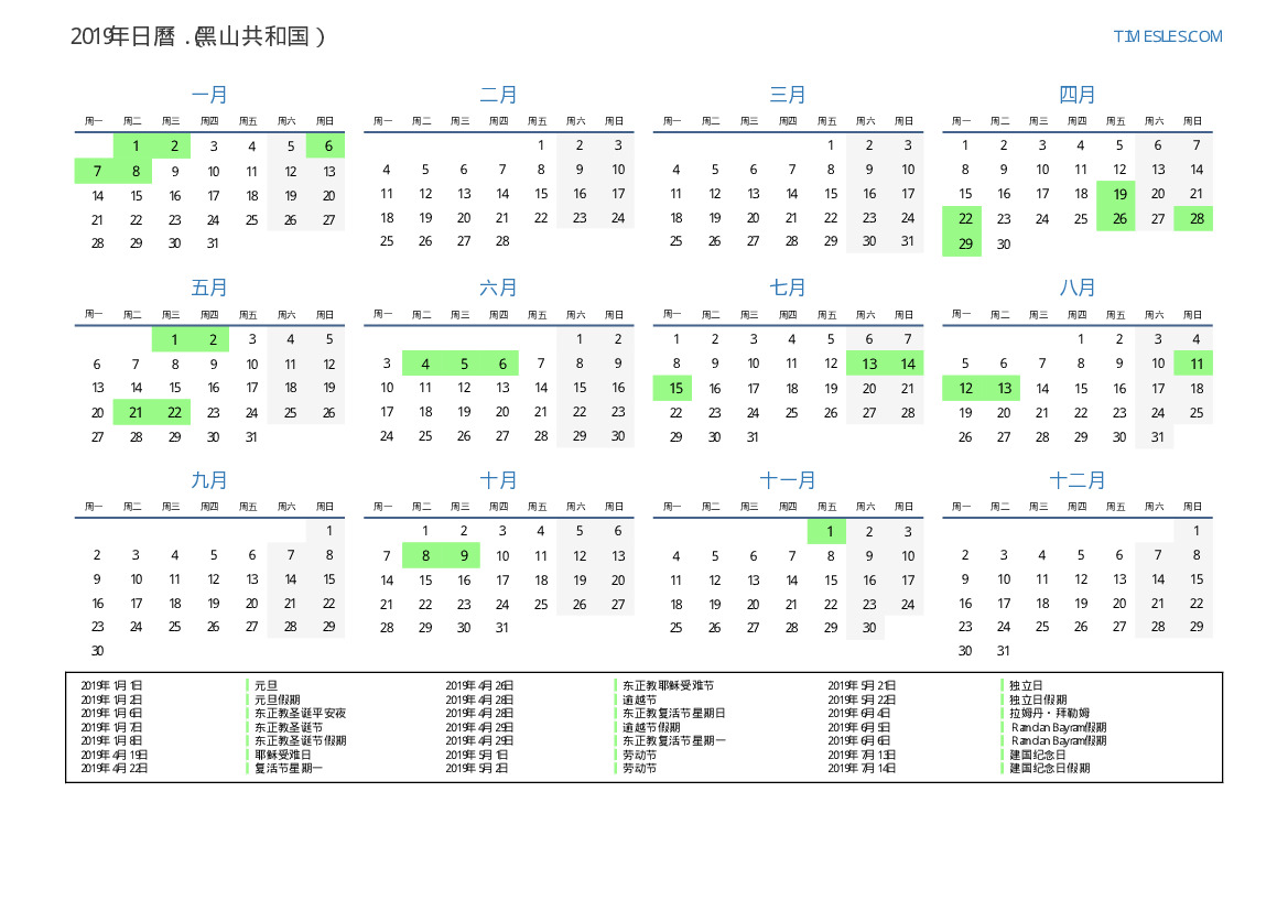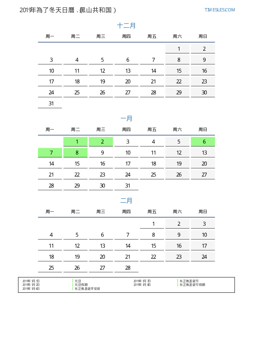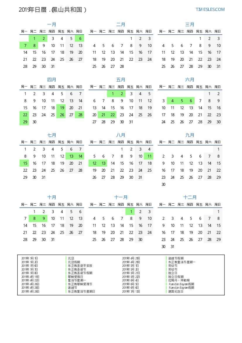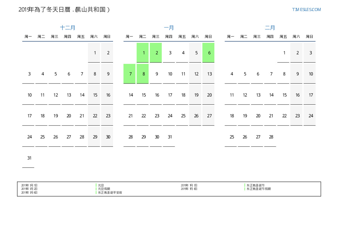 下載並打印2019年黑山共和国節假日和周末的PDF日曆