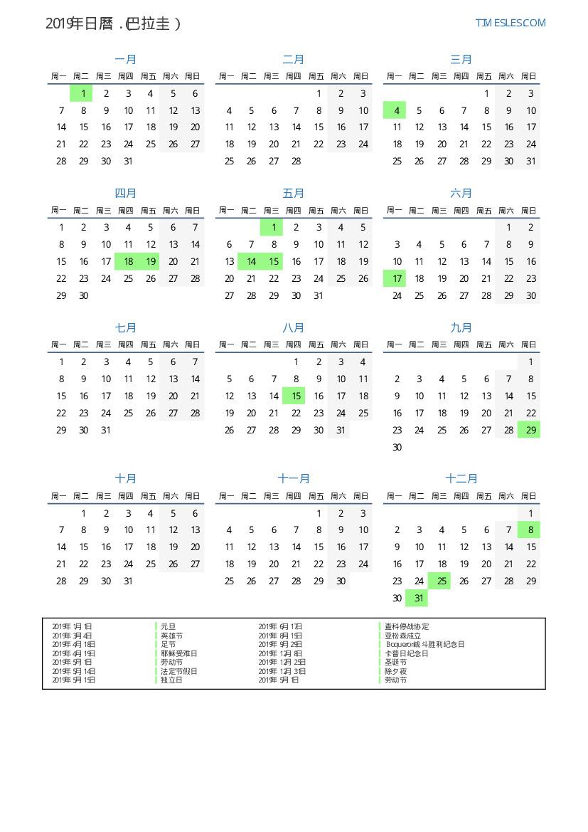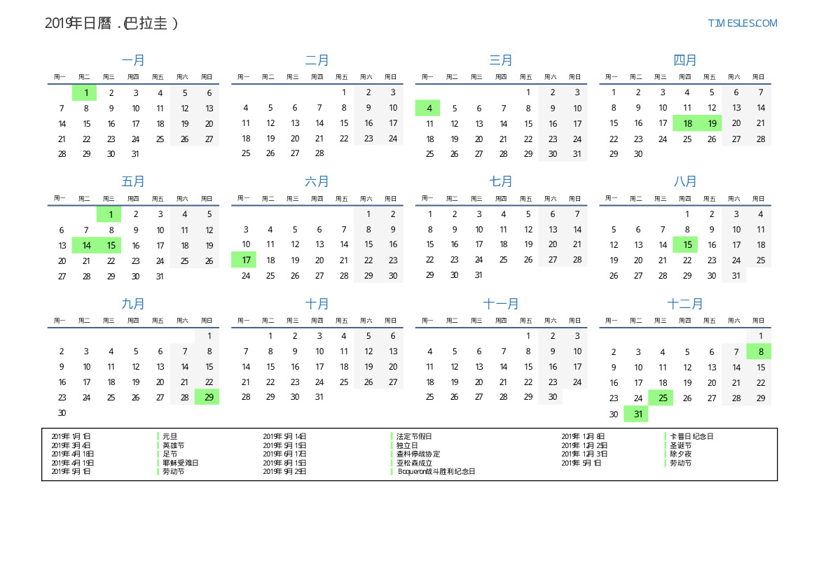 下載並打印2019年巴拉圭節假日和周末的PDF日曆