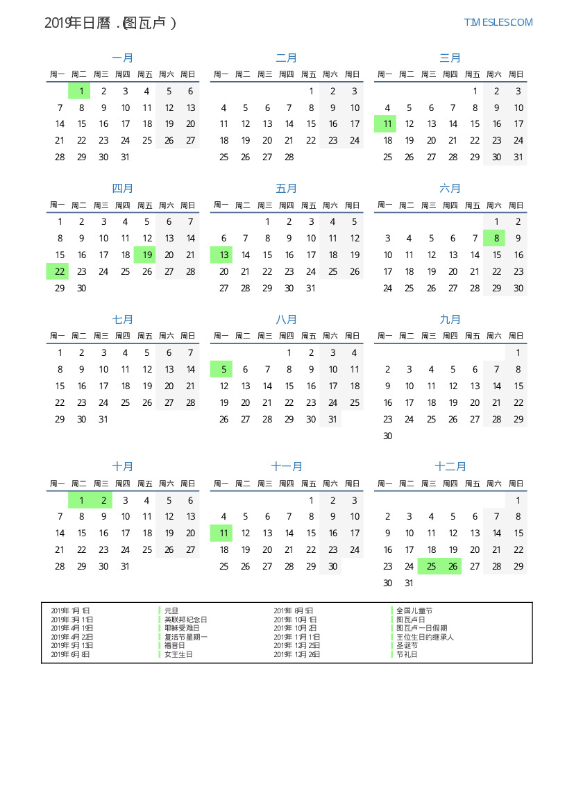 下載並打印2019年对于图瓦卢節假日和周末的PDF日曆