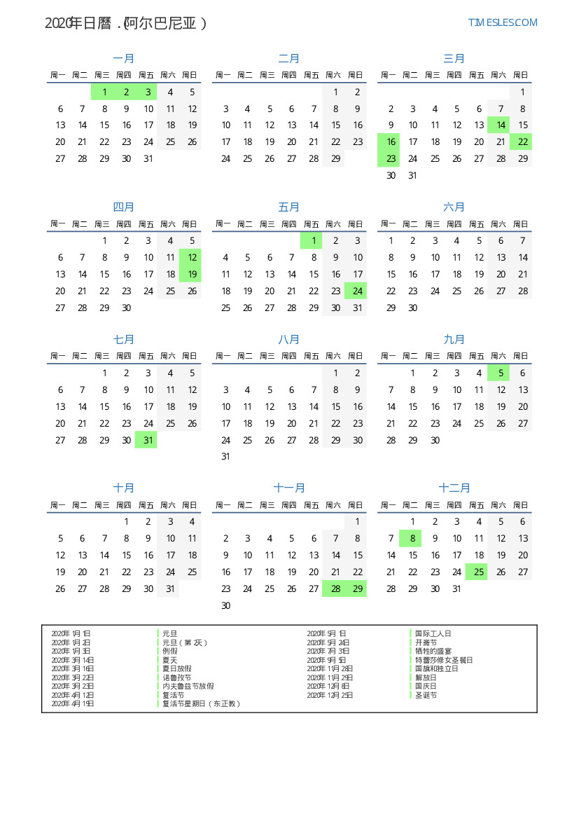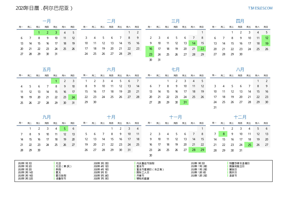 下載並打印2020年阿尔巴尼亚節假日和周末的PDF日曆