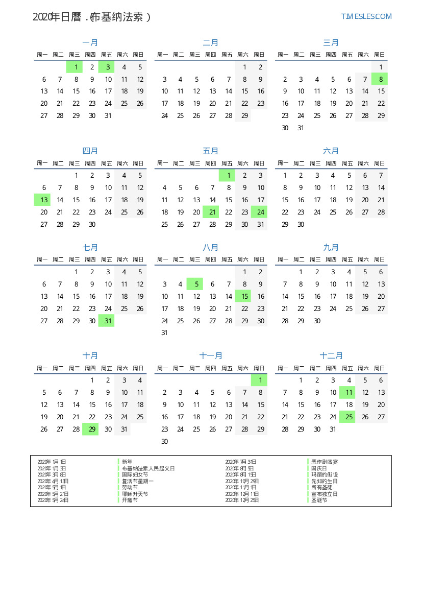 下載並打印2020年布基纳法索節假日和周末的PDF日曆