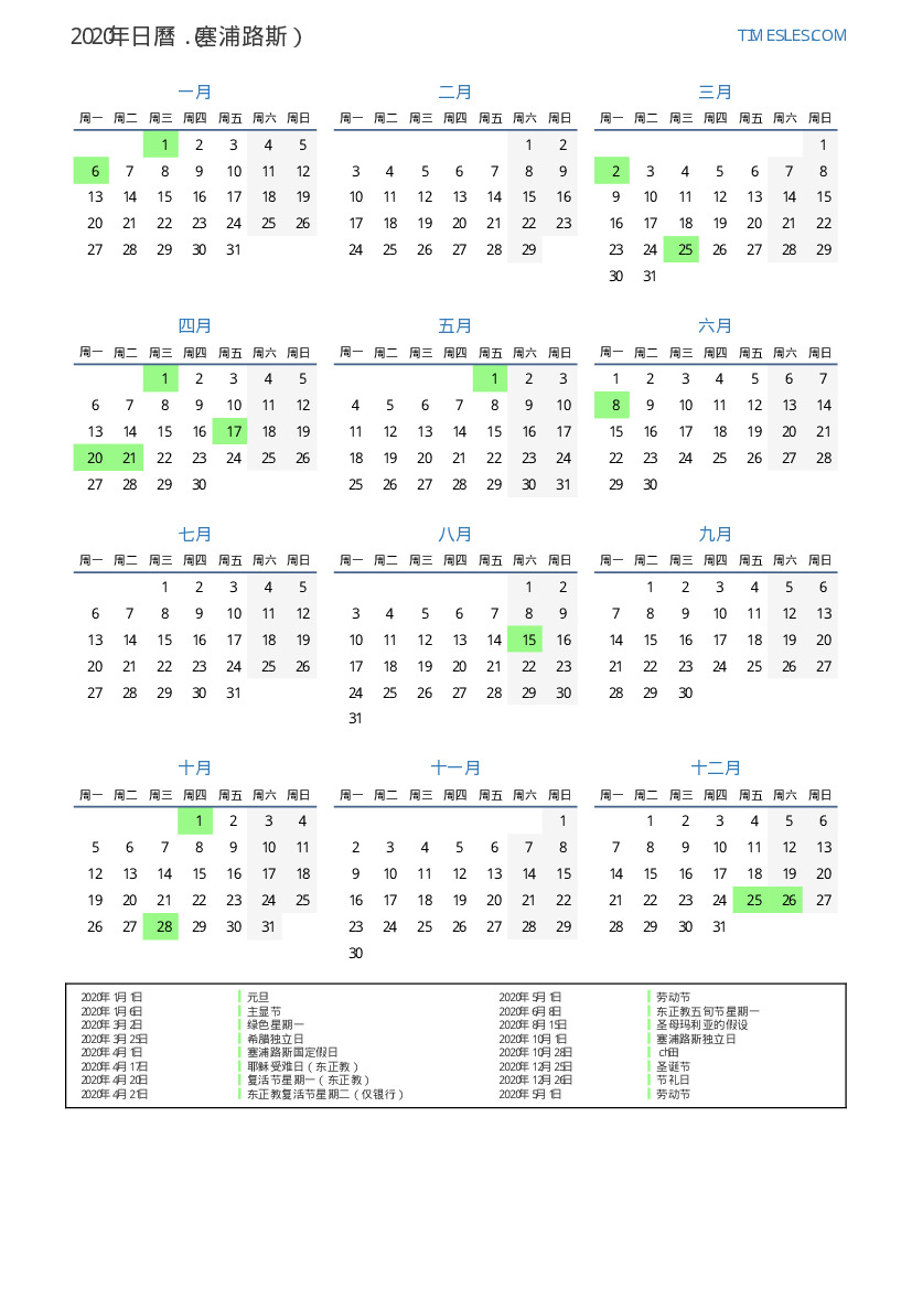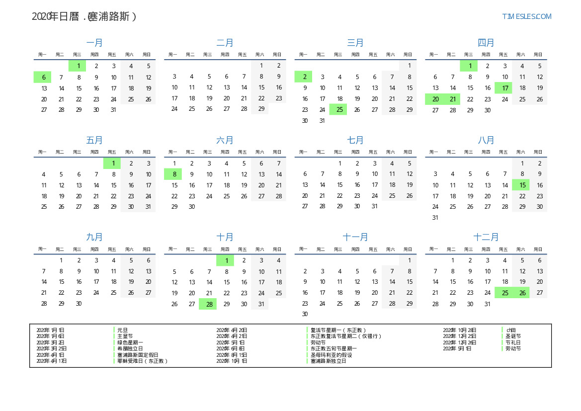 下載並打印2020年塞浦路斯節假日和周末的PDF日曆