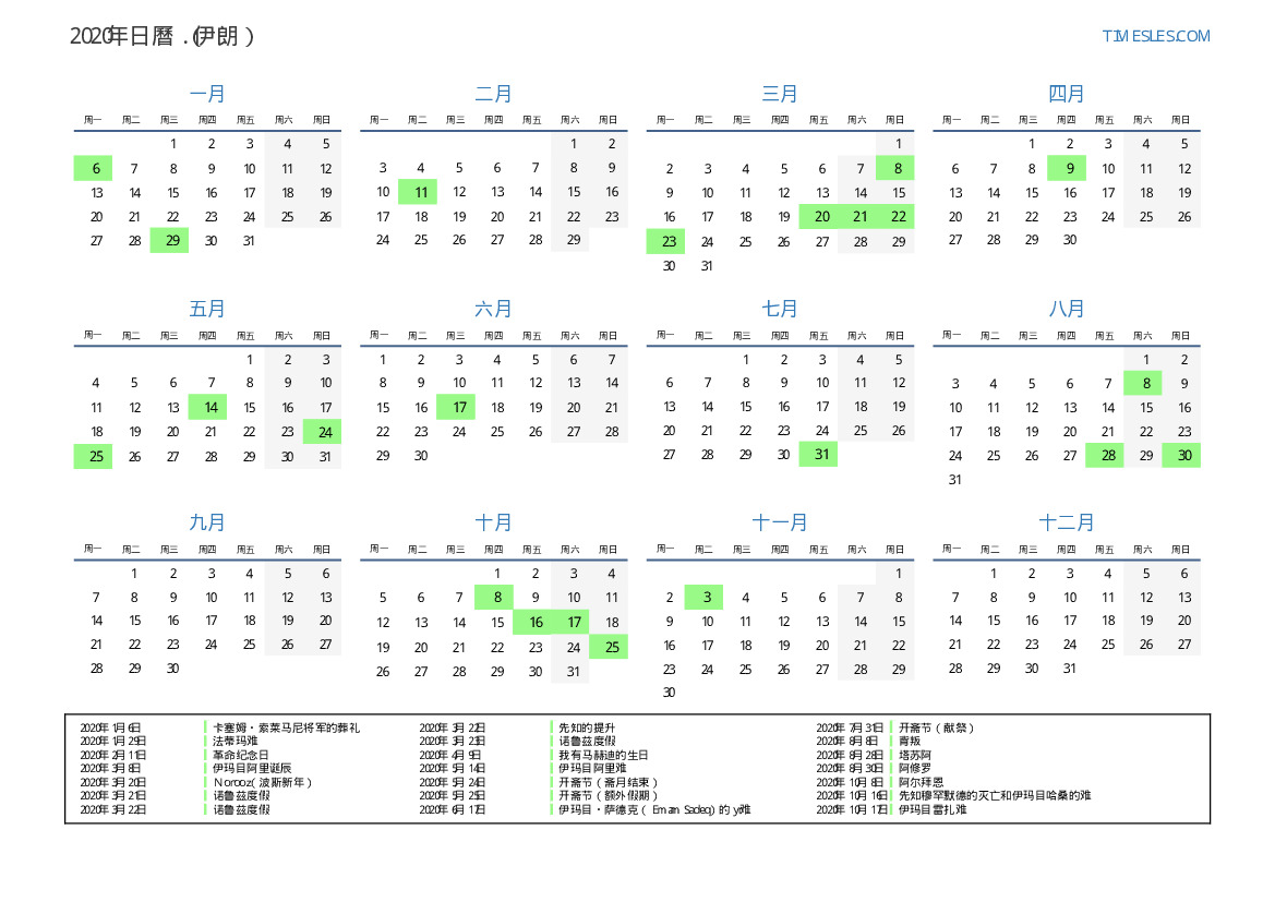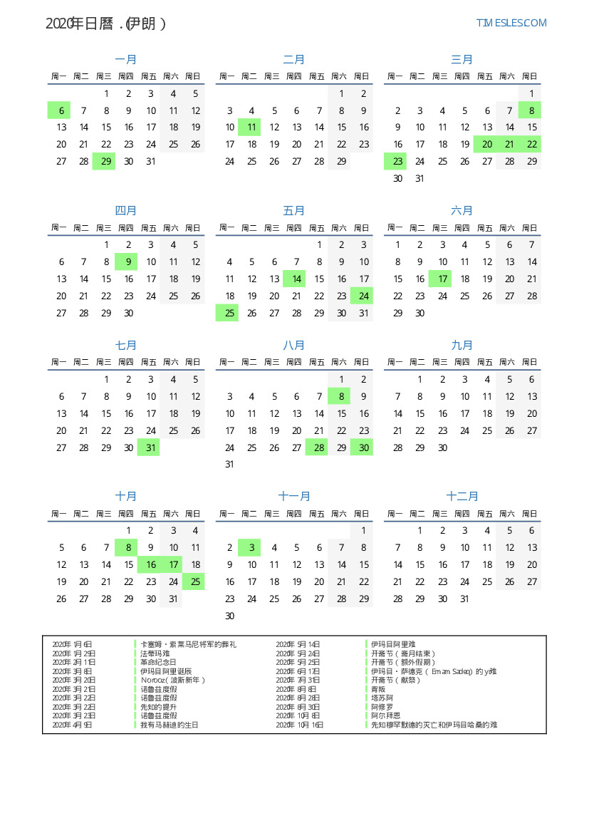 下載並打印2020年伊朗節假日和周末的PDF日曆