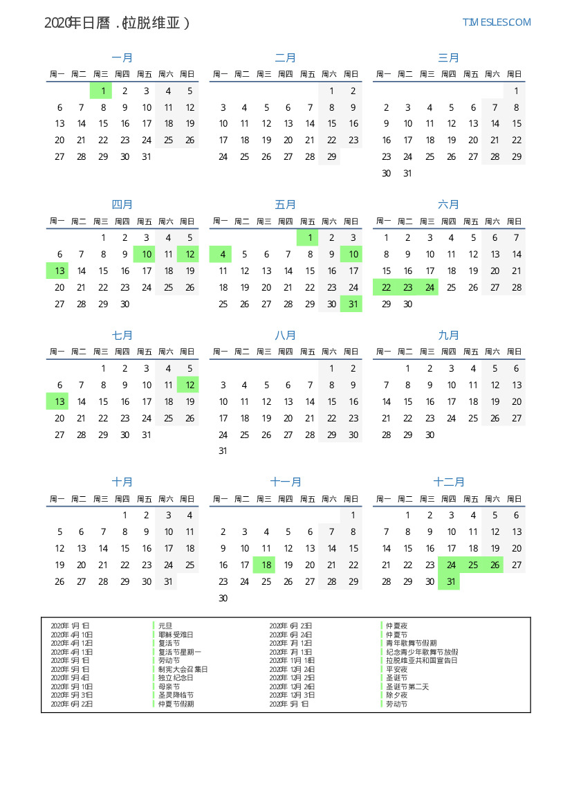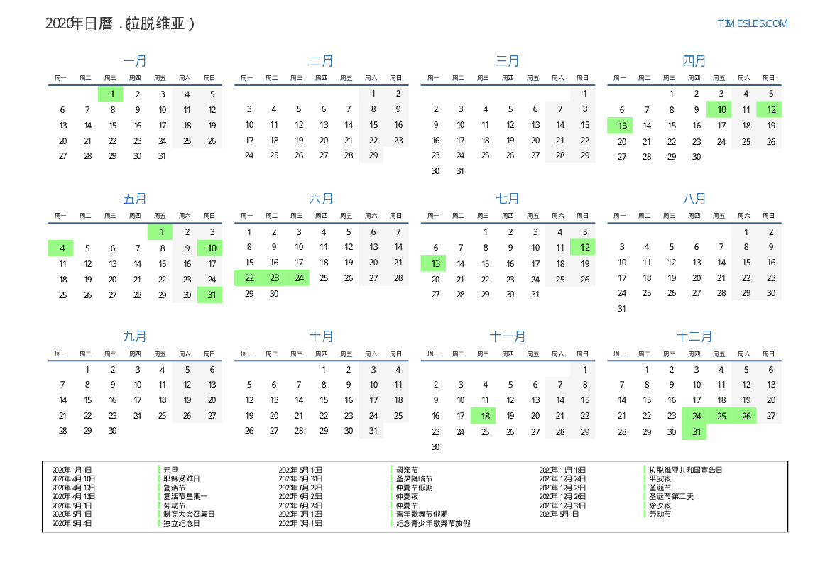 下載並打印2020年拉脱维亚節假日和周末的PDF日曆