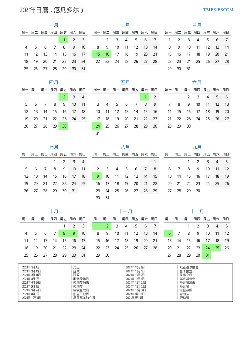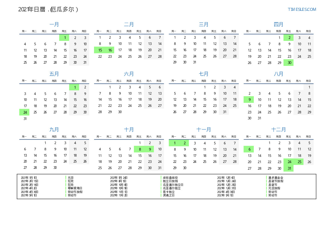 下載並打印2021年厄瓜多尔節假日和周末的PDF日曆