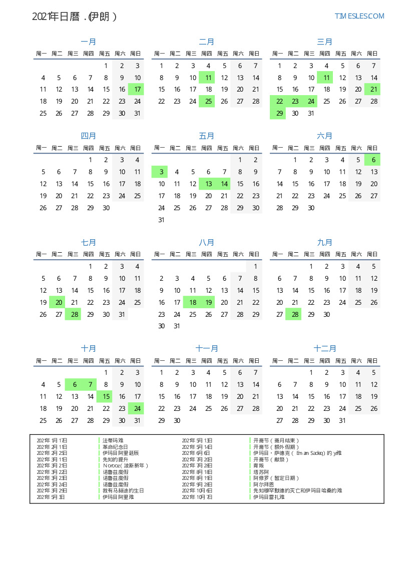 下載並打印2021年伊朗節假日和周末的PDF日曆