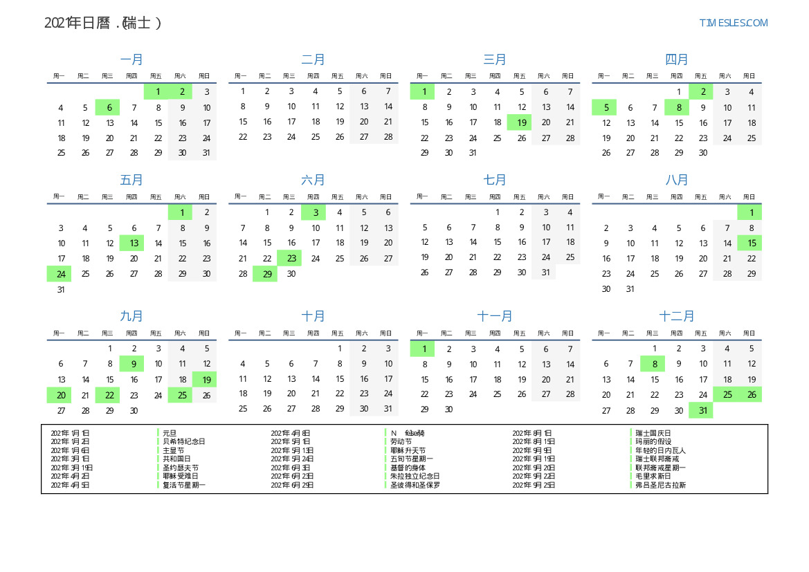 下載並打印2021年瑞士節假日和周末的PDF日曆