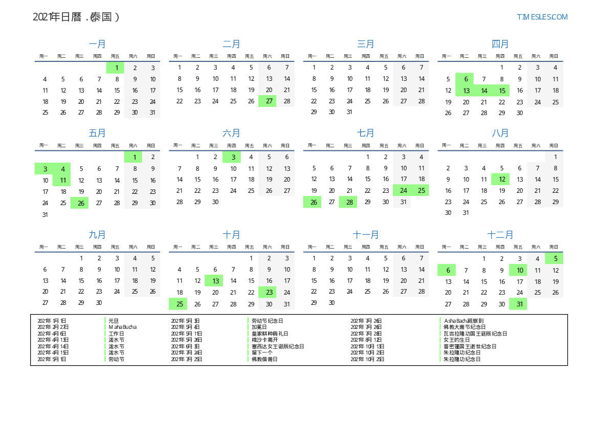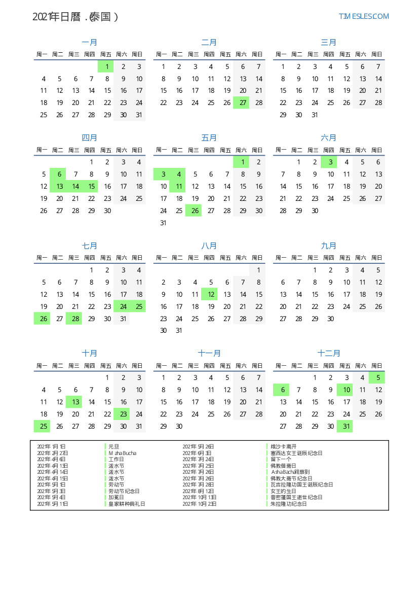 下載並打印2021年为泰国節假日和周末的PDF日曆