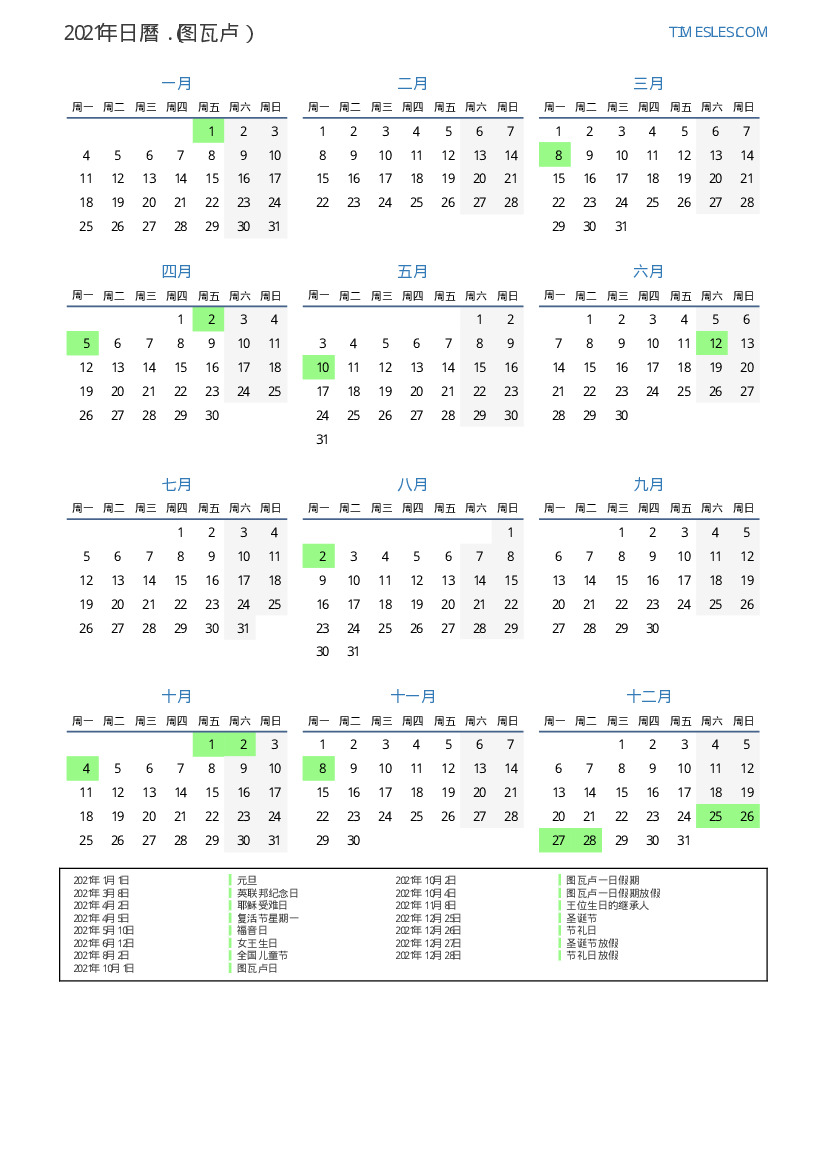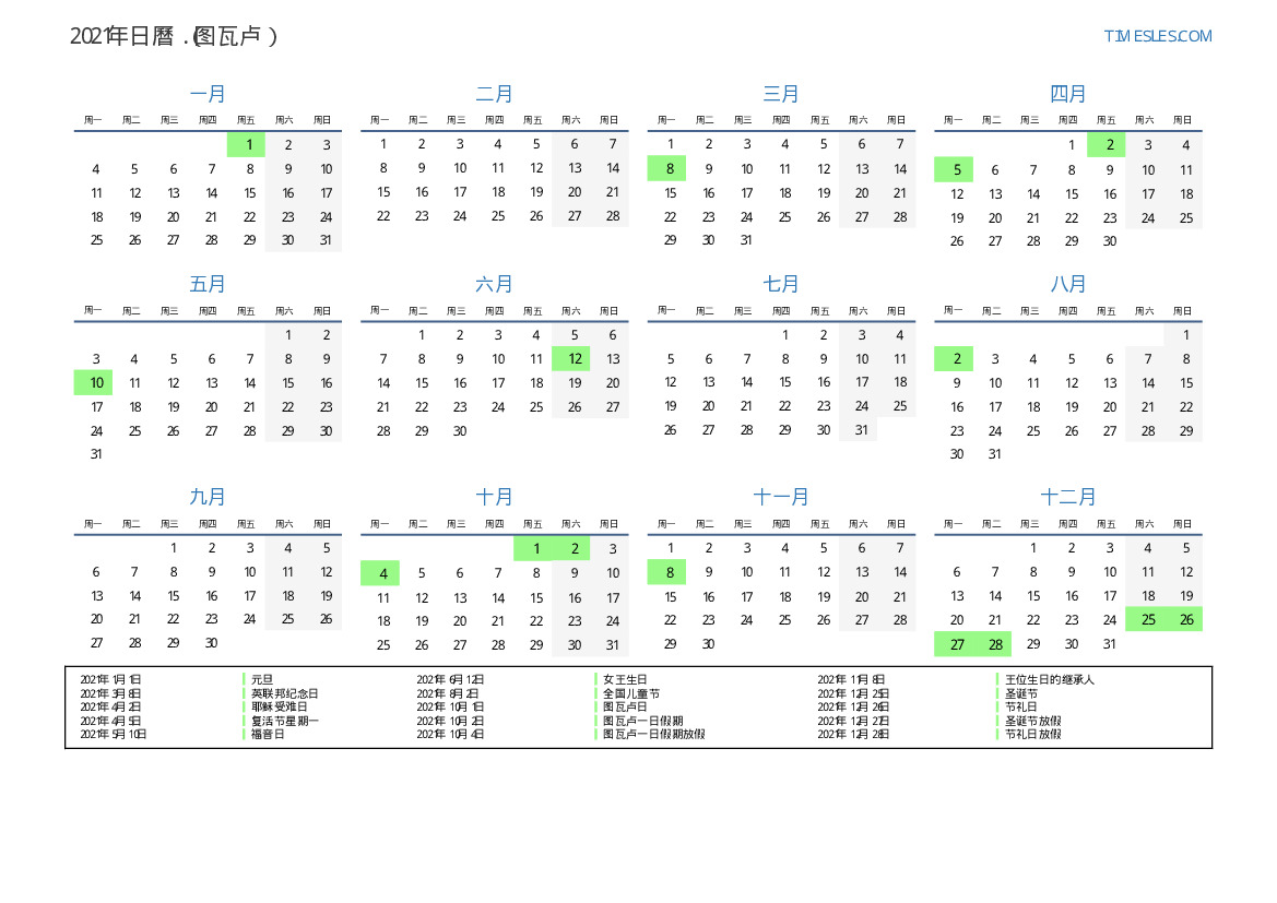 盧薩对于图瓦卢的2021年假期和周末日曆
