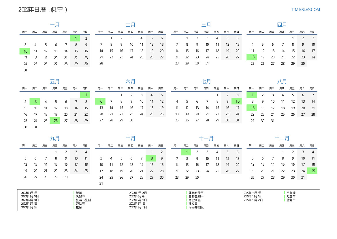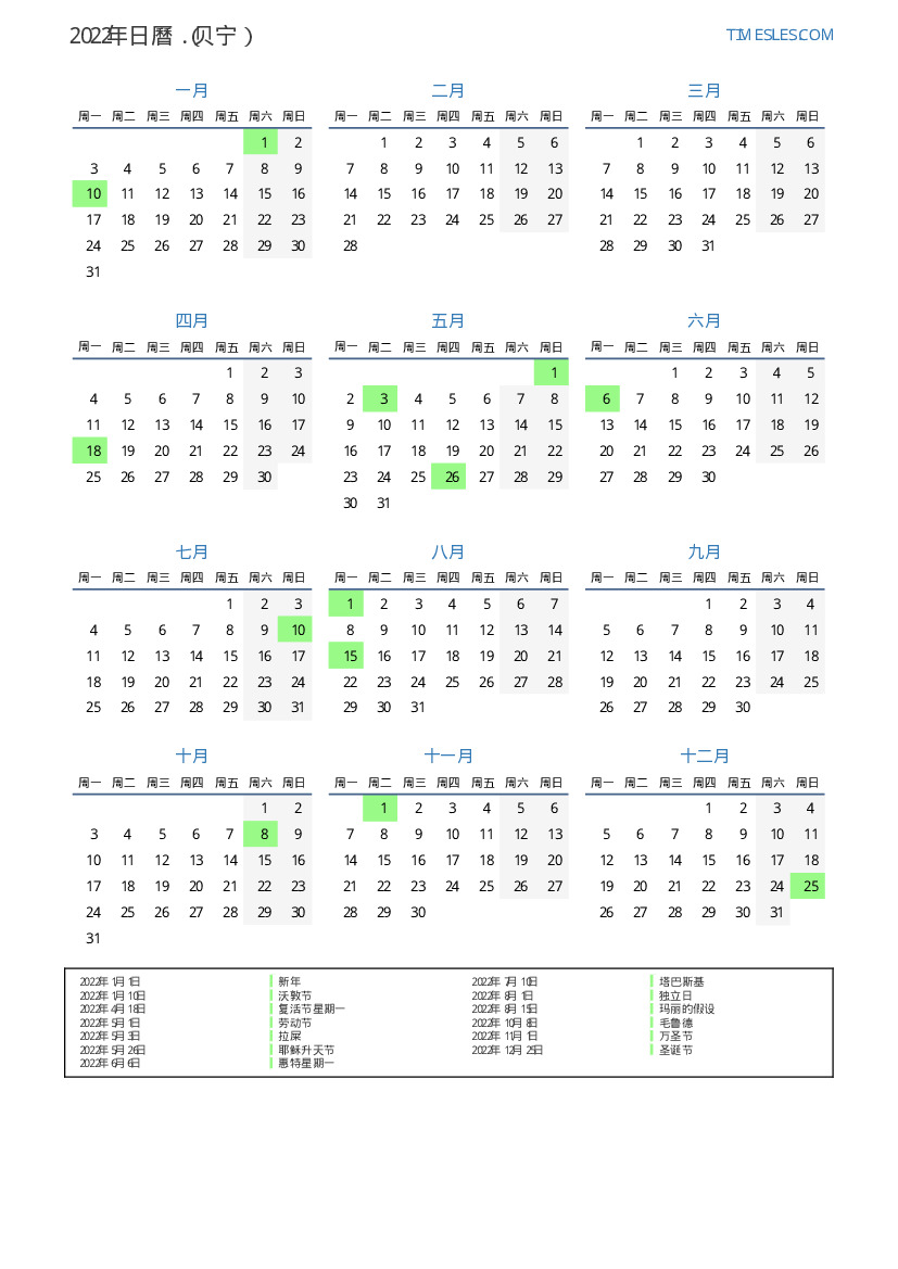下載並打印2022年贝宁節假日和周末的PDF日曆