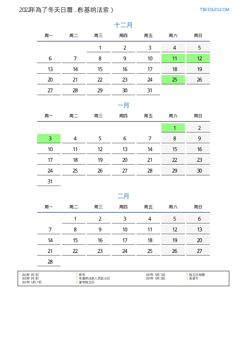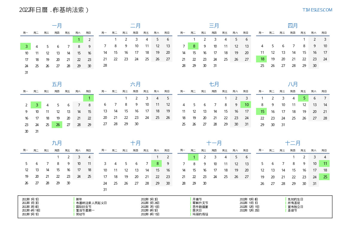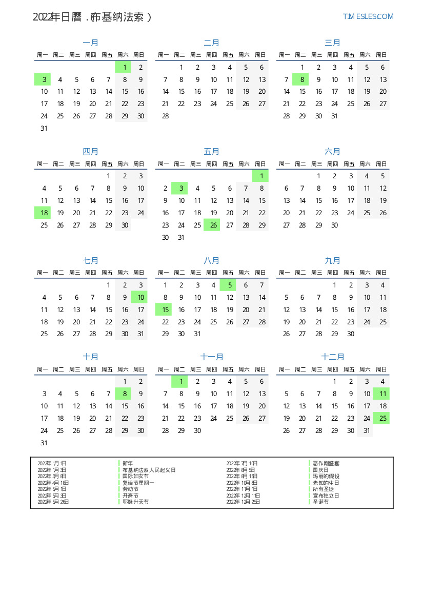 下載並打印2022年布基纳法索節假日和周末的PDF日曆