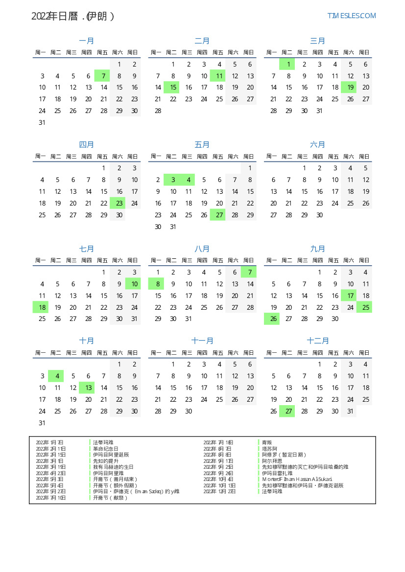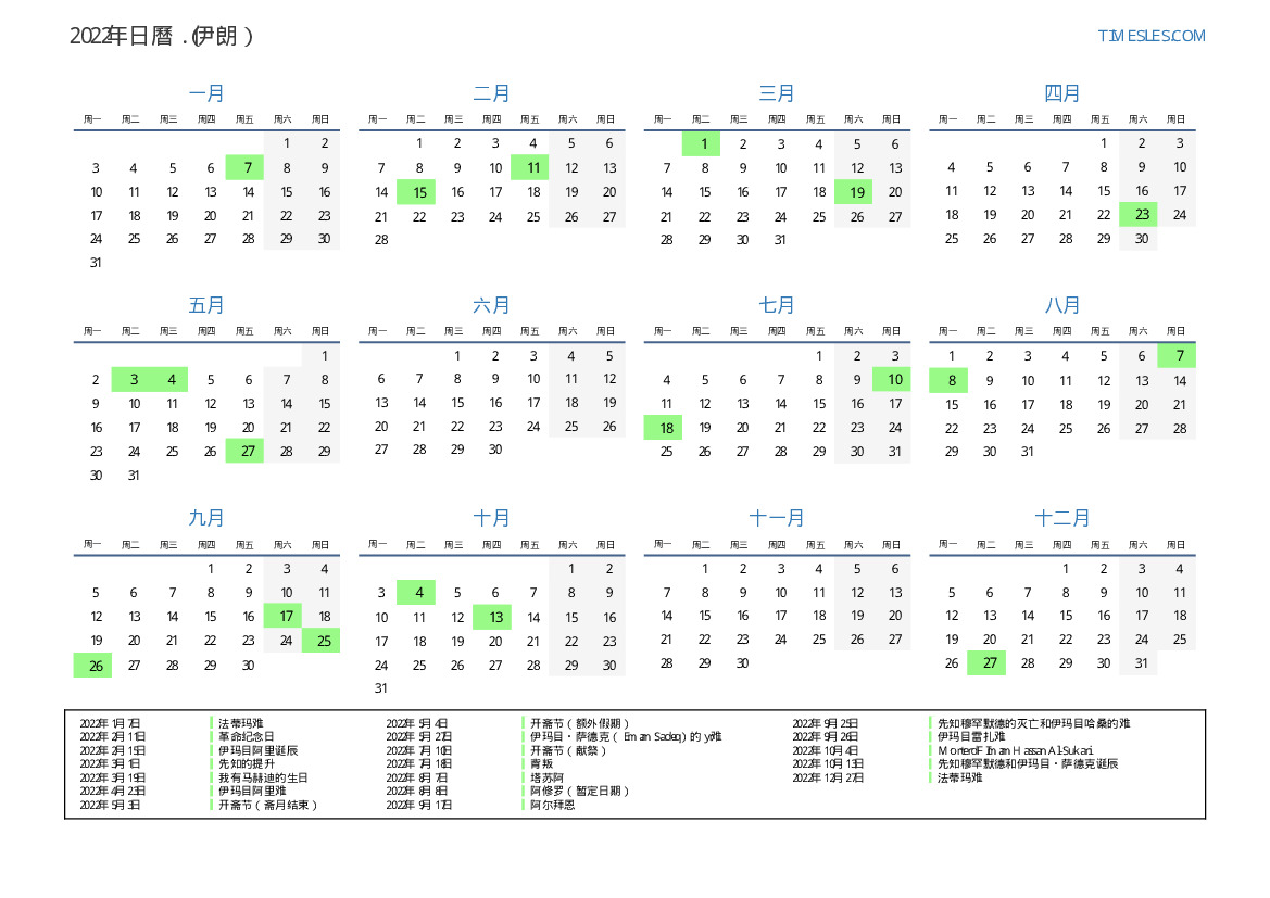 下載並打印2022年伊朗節假日和周末的PDF日曆