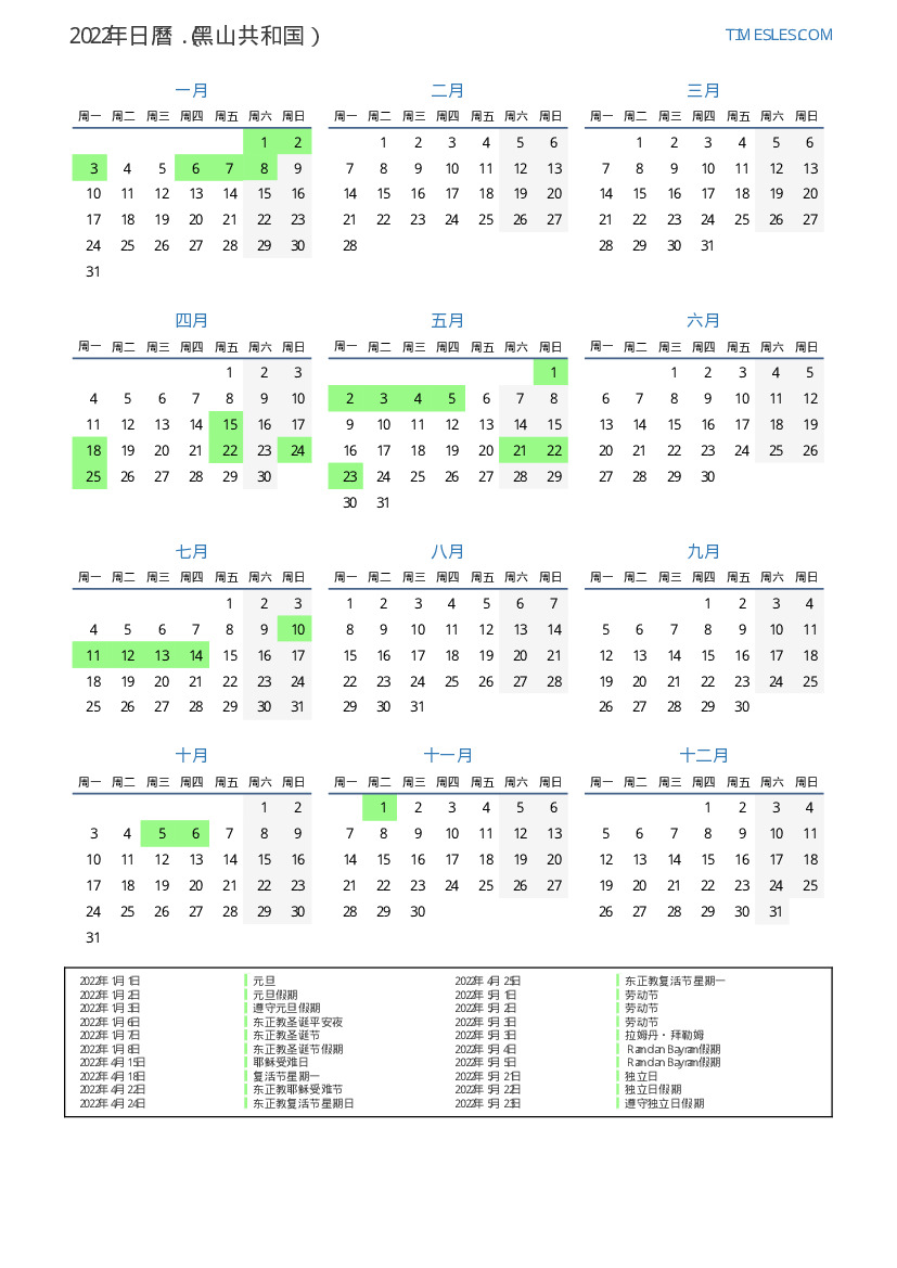 下載並打印2022年黑山共和国節假日和周末的PDF日曆