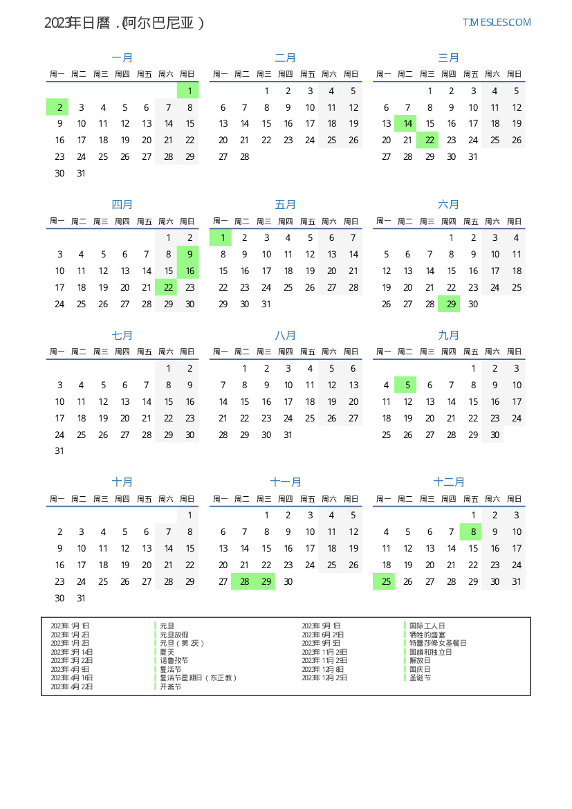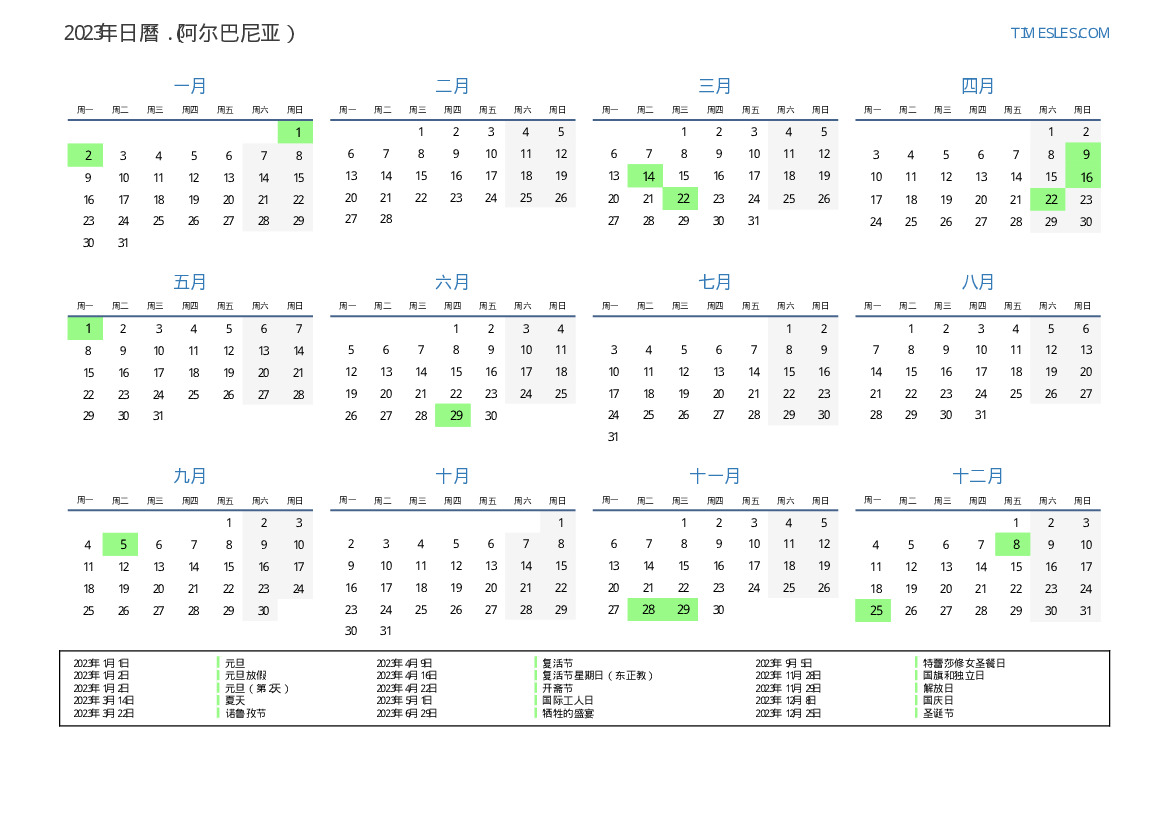 下載並打印2023年阿尔巴尼亚節假日和周末的PDF日曆