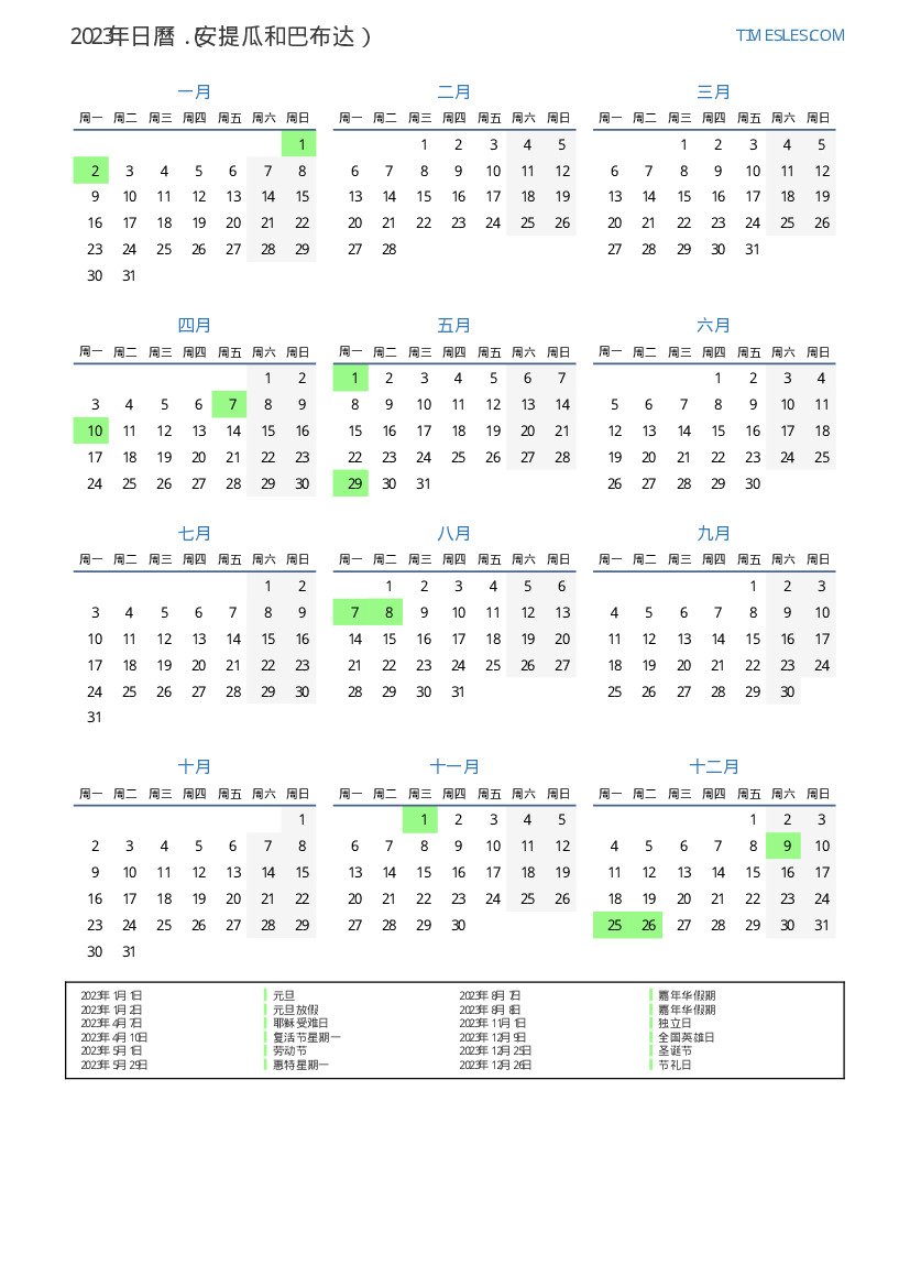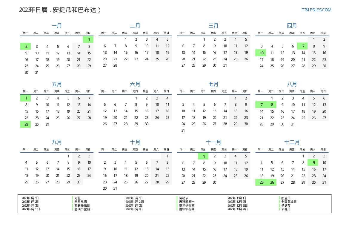 下載並打印2023年安提瓜和巴布达節假日和周末的PDF日曆
