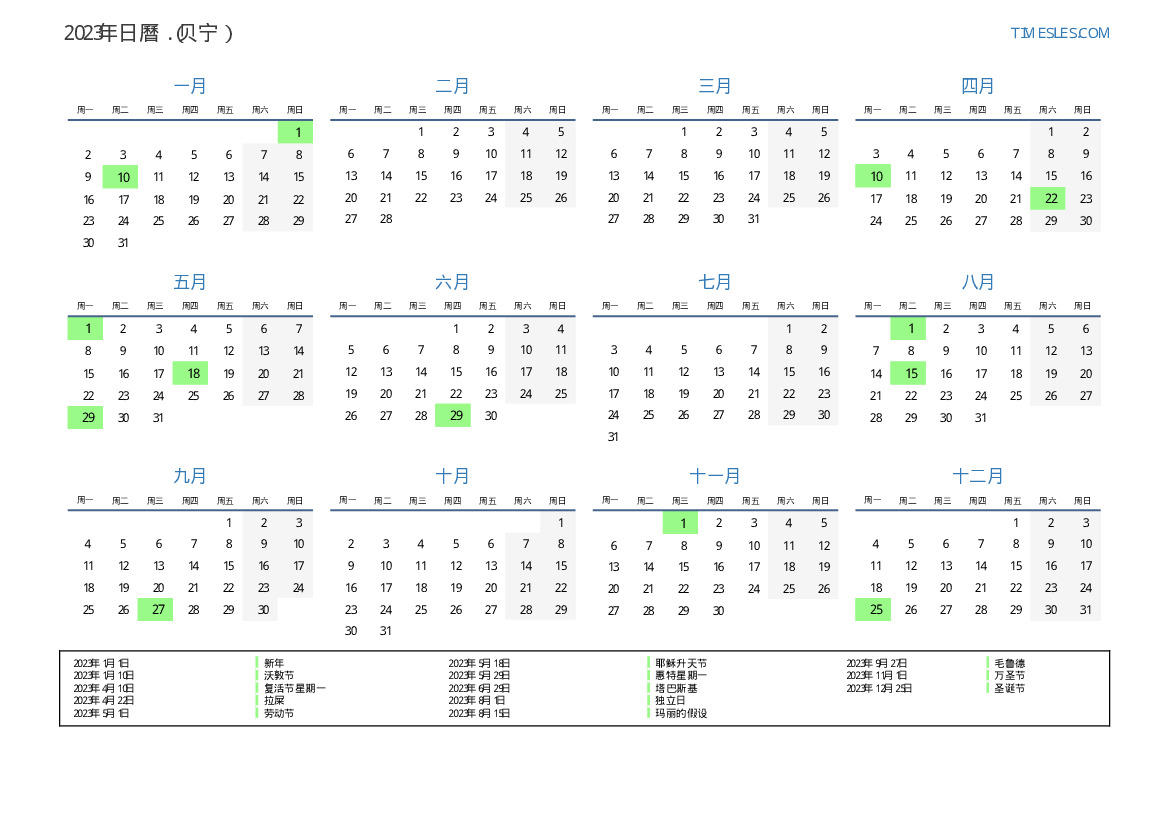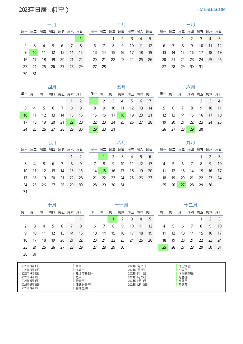 下載並打印2023年贝宁節假日和周末的PDF日曆
