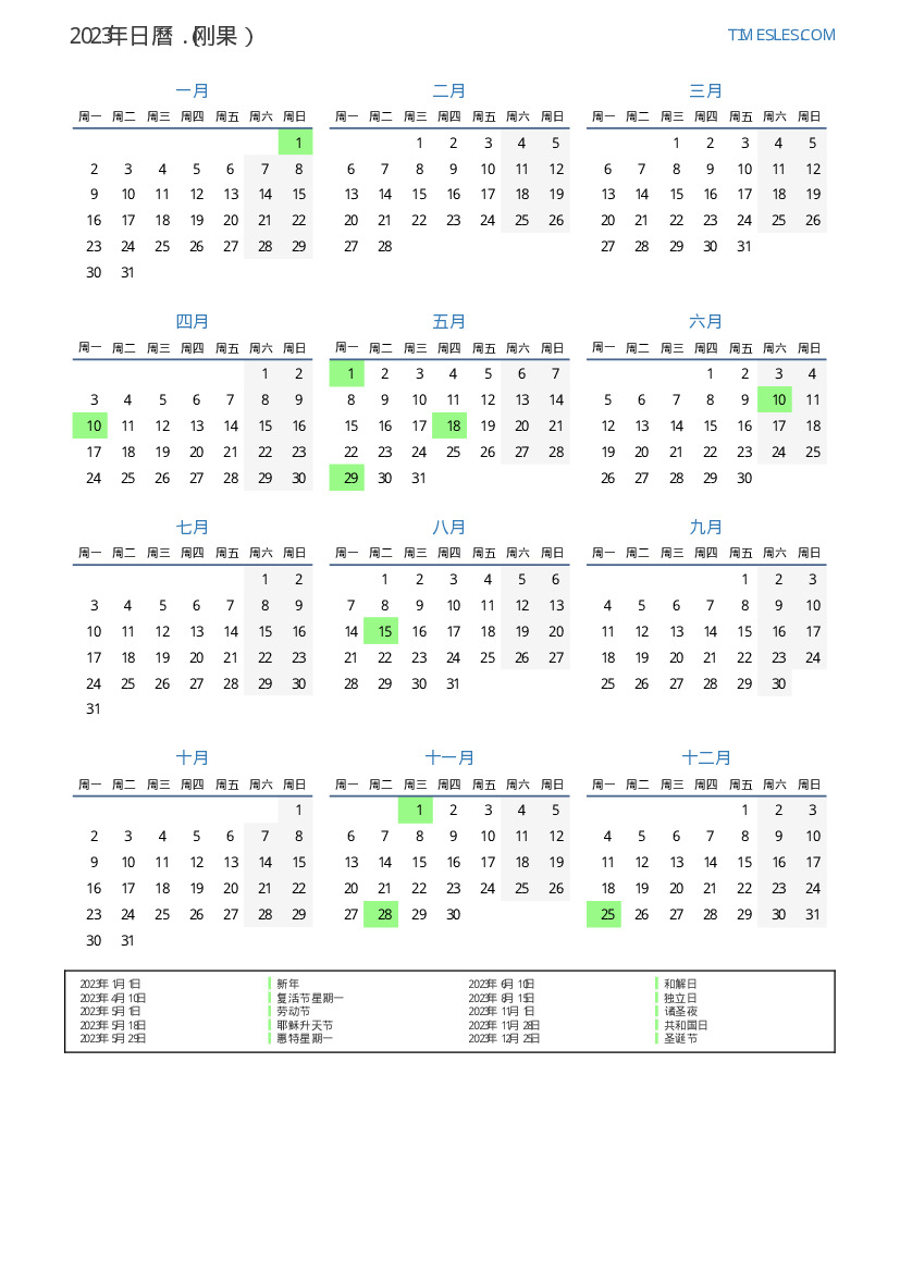 下載並打印2023年刚果節假日和周末的PDF日曆