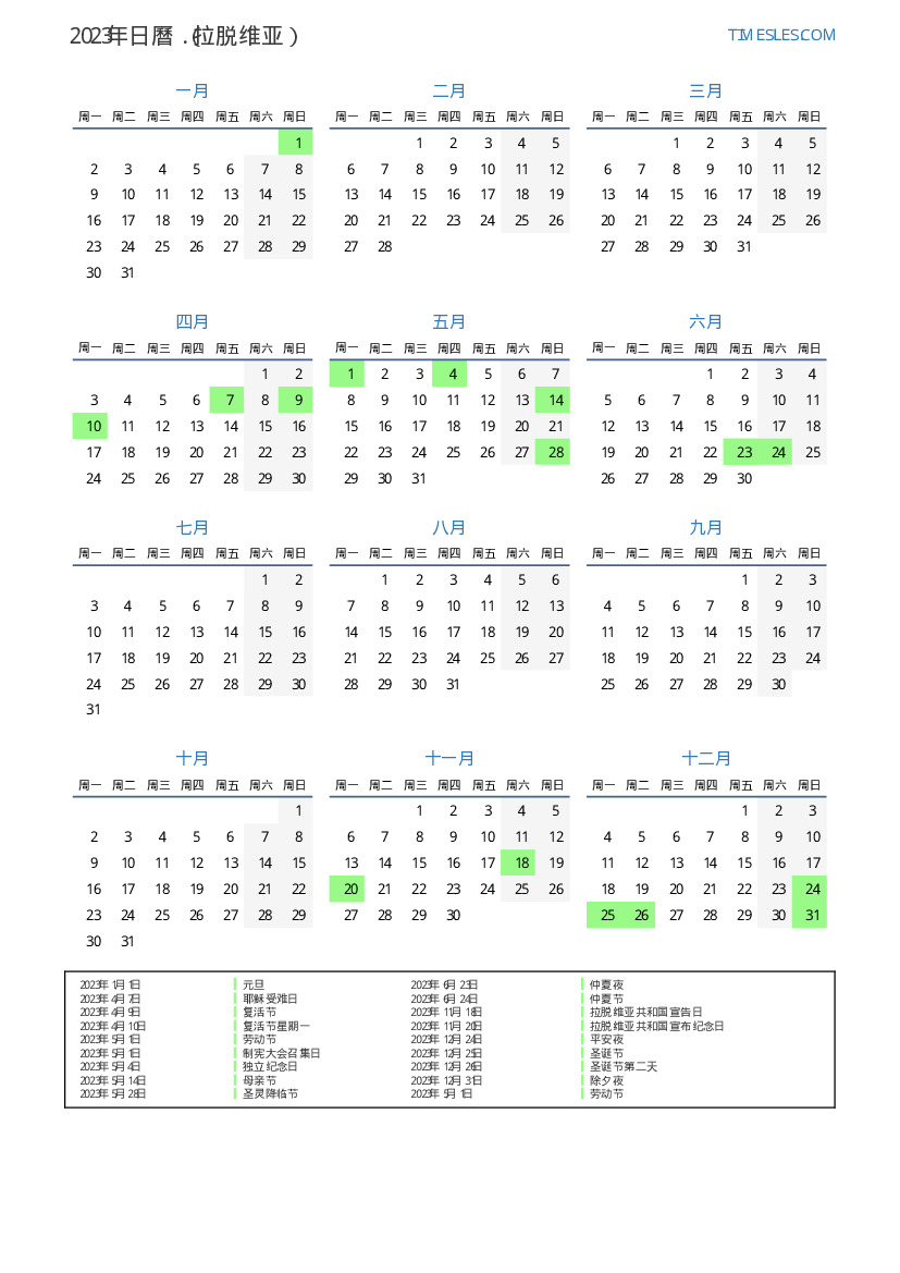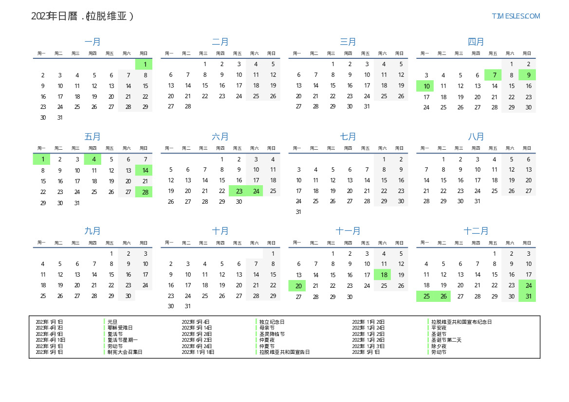 下載並打印2023年拉脱维亚節假日和周末的PDF日曆