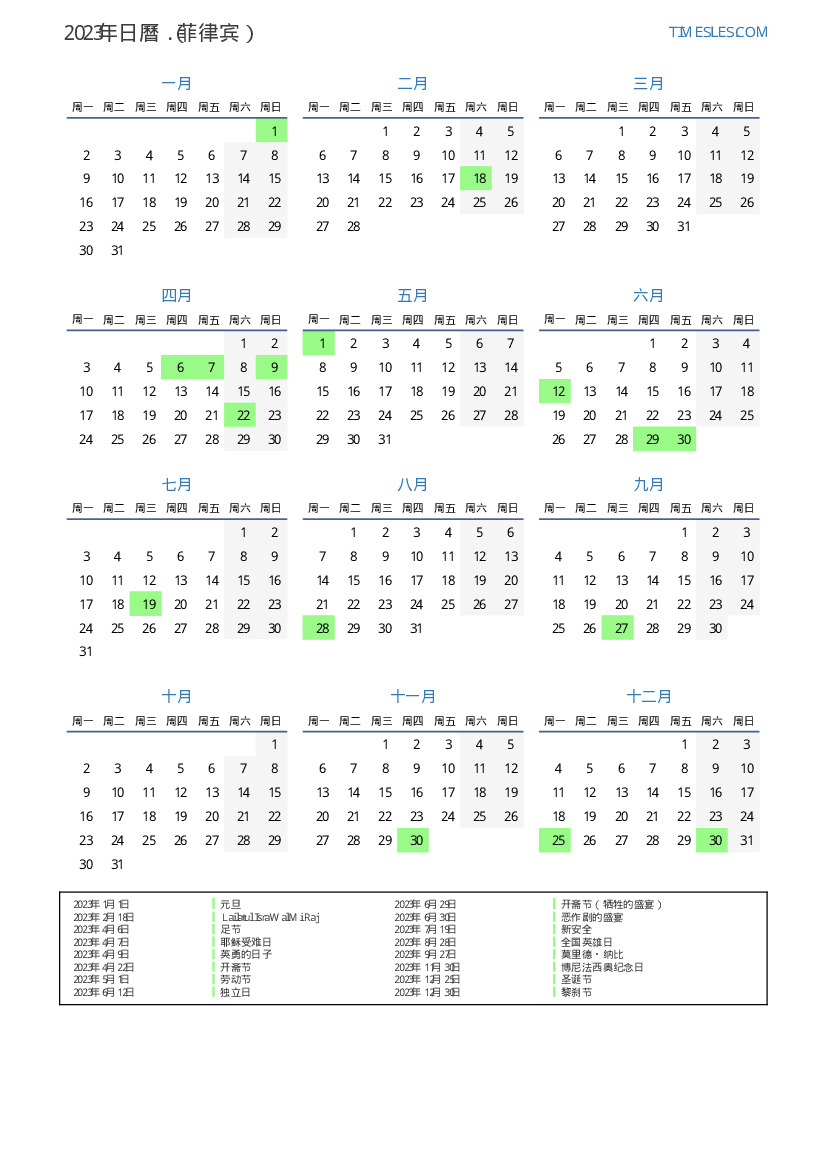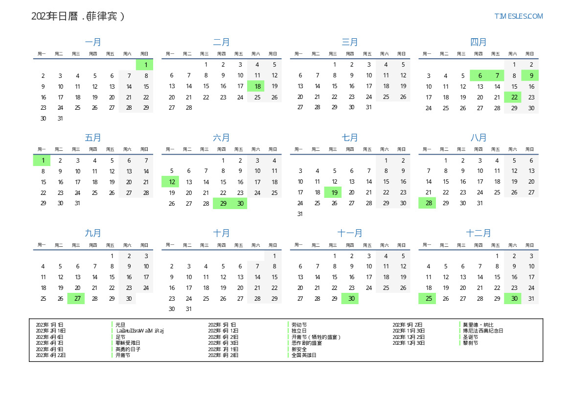 下載並打印2023年菲律宾節假日和周末的PDF日曆