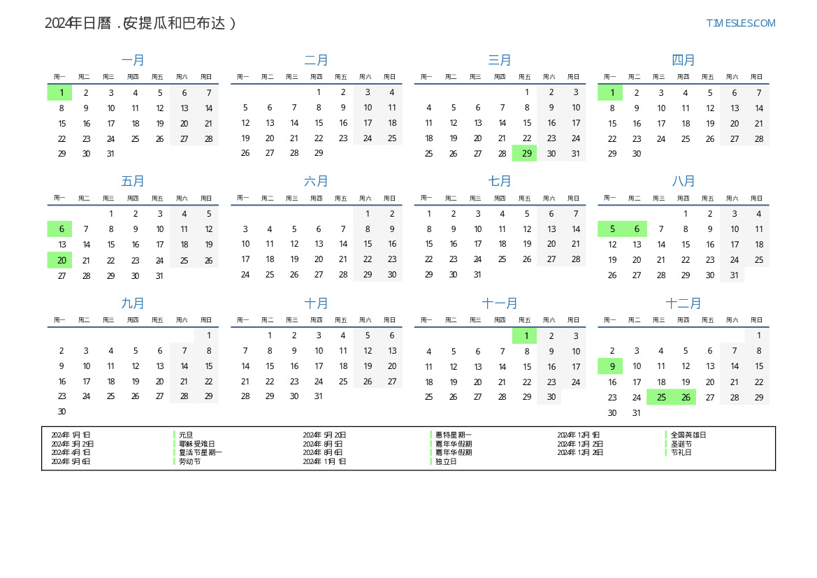 2024年安提瓜和巴布达日曆