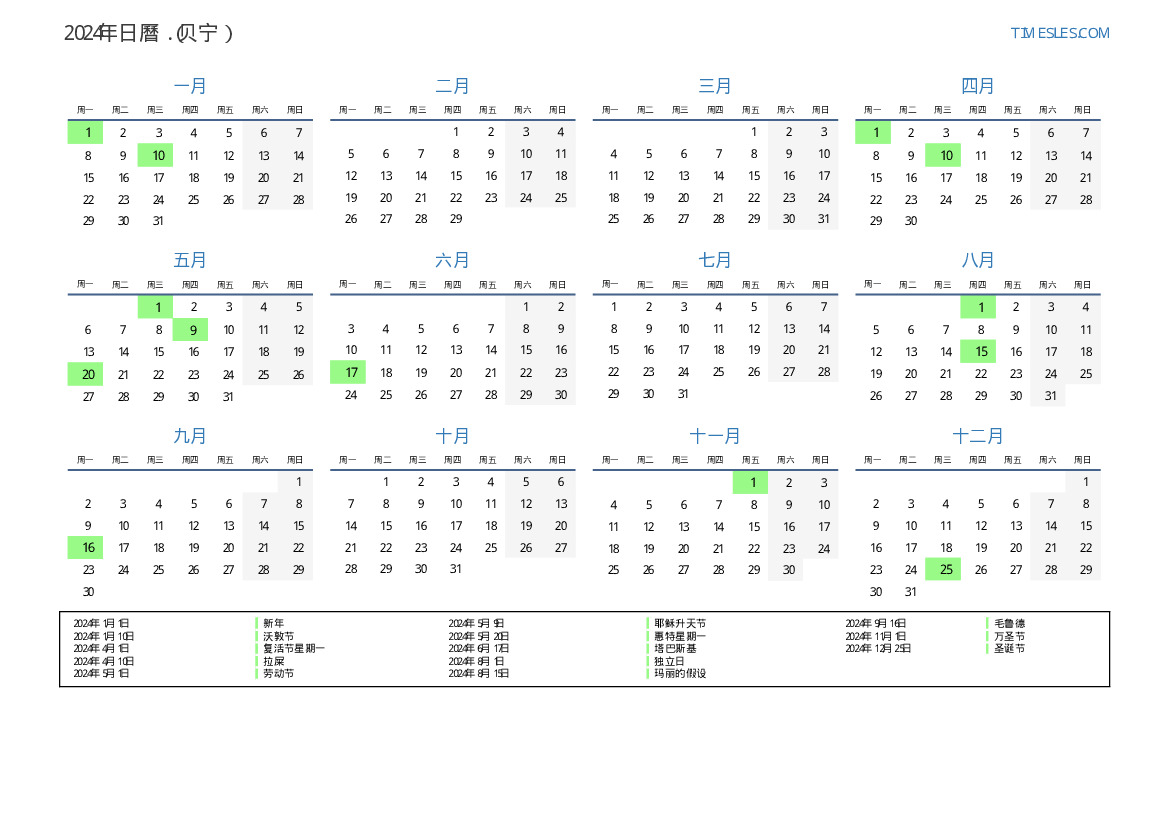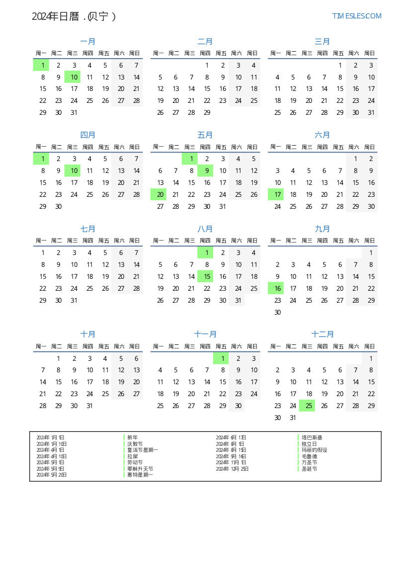 下載並打印2024年贝宁節假日和周末的PDF日曆