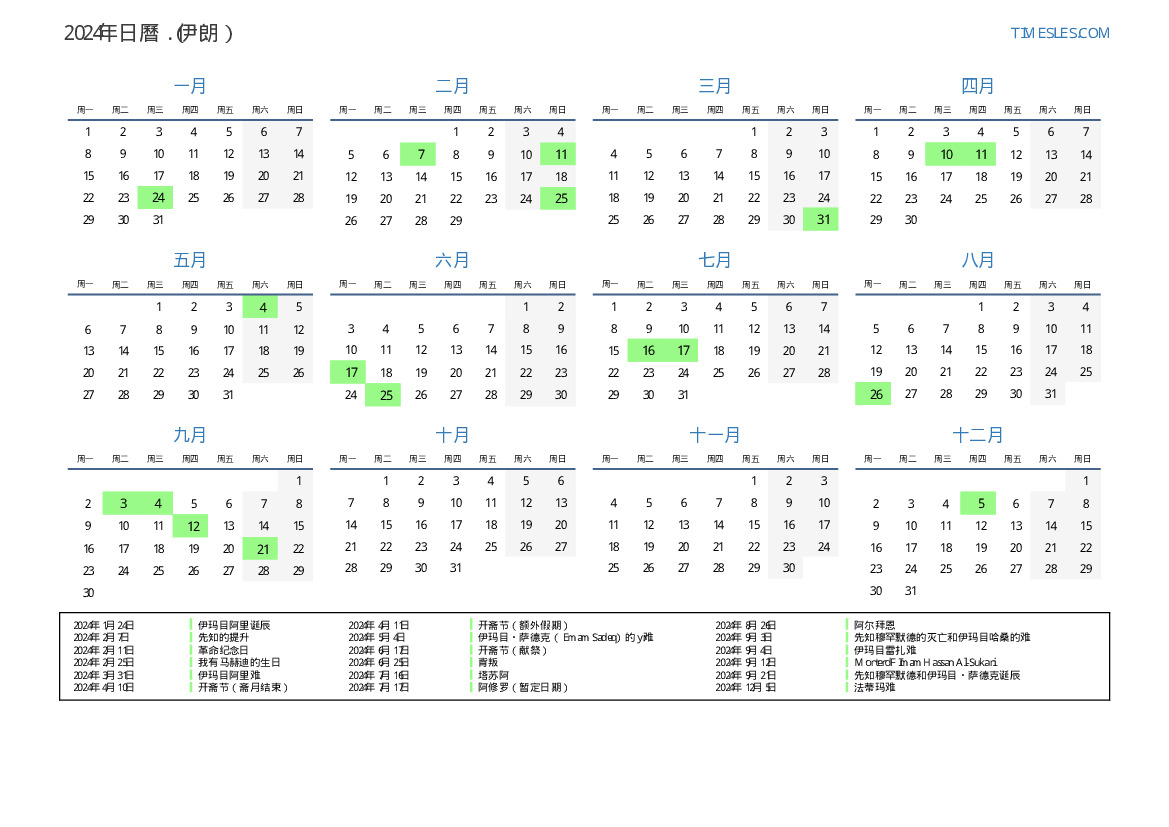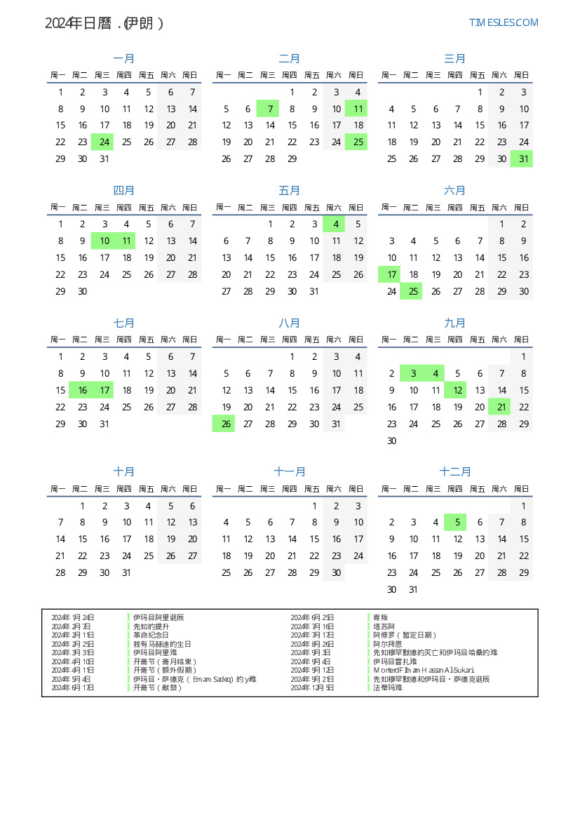 下載並打印2024年伊朗節假日和周末的PDF日曆