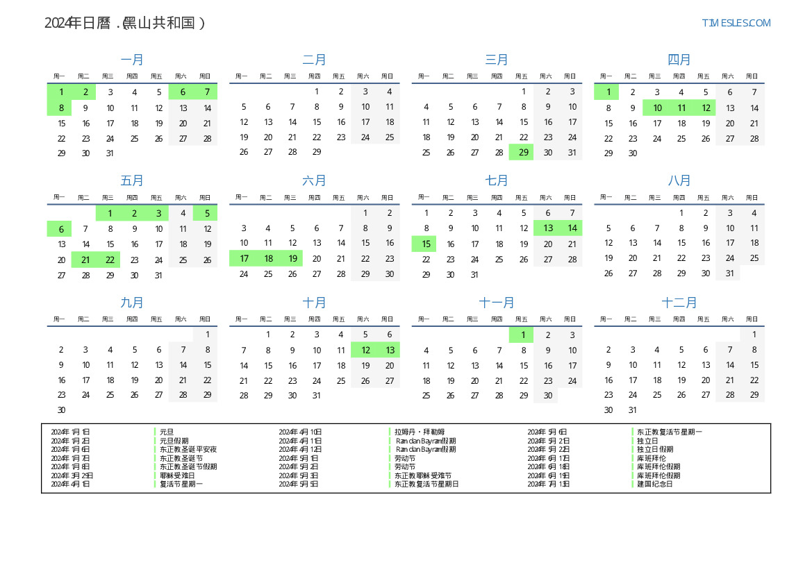 下載並打印2024年黑山共和国節假日和周末的PDF日曆