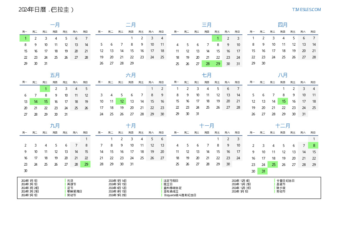 下載並打印2024年巴拉圭節假日和周末的PDF日曆