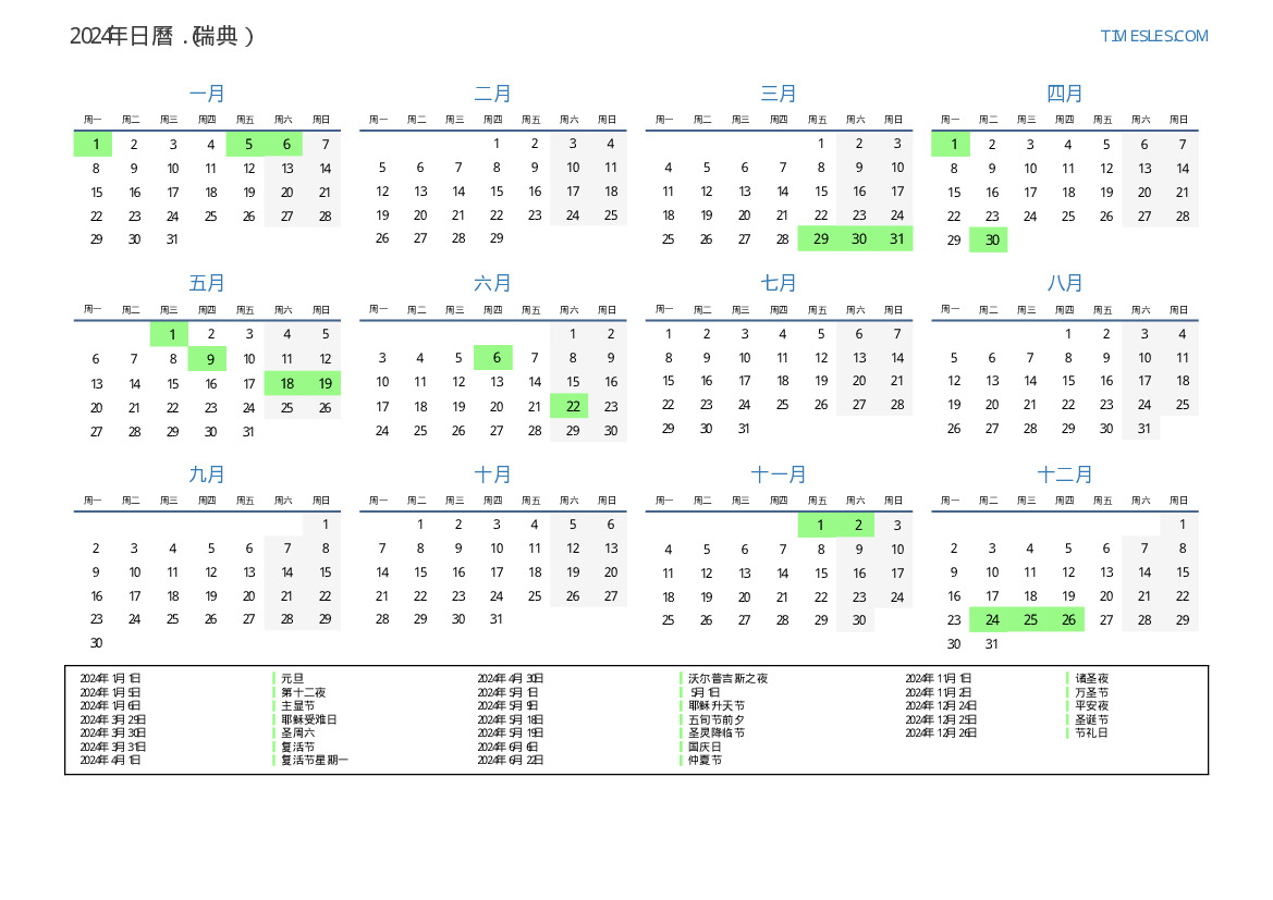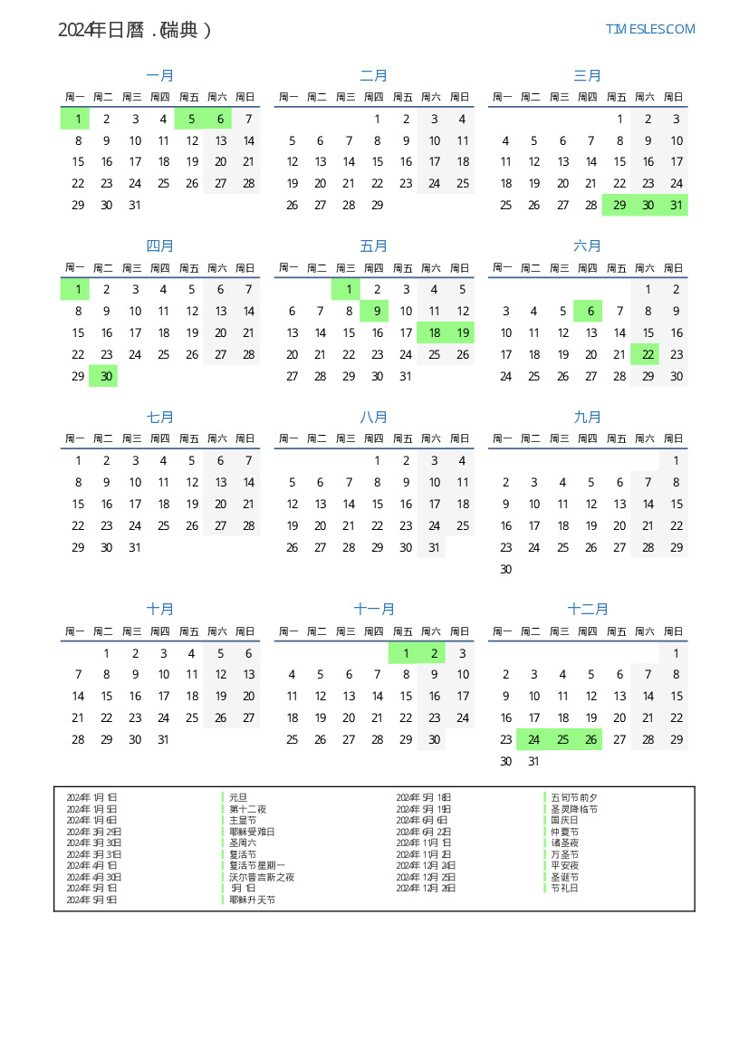 2024年瑞典日曆
