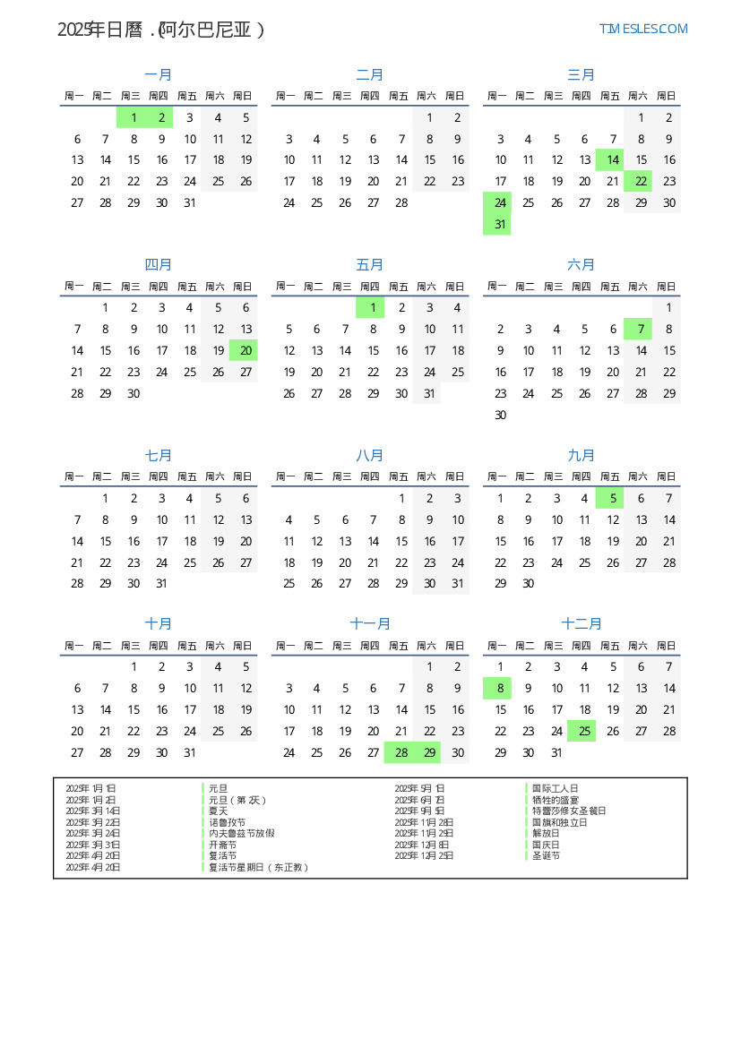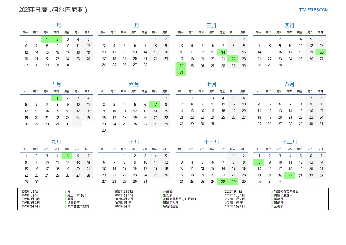 下載並打印2025年阿尔巴尼亚節假日和周末的PDF日曆
