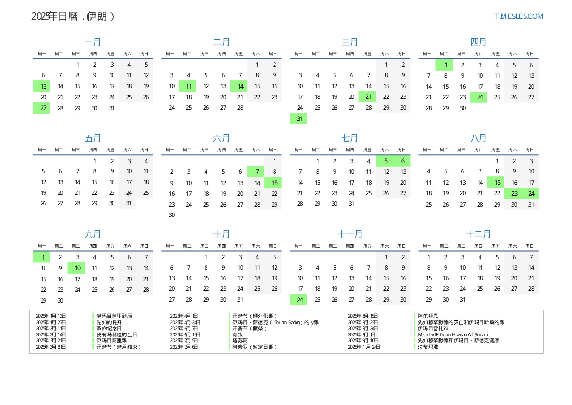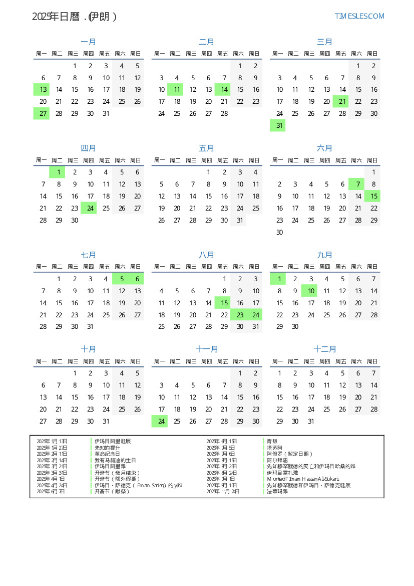 下載並打印2025年伊朗節假日和周末的PDF日曆