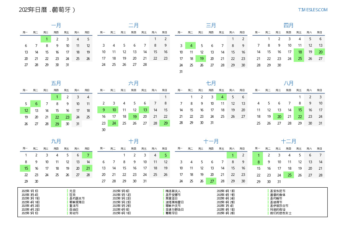 下載並打印2025年葡萄牙節假日和周末的PDF日曆