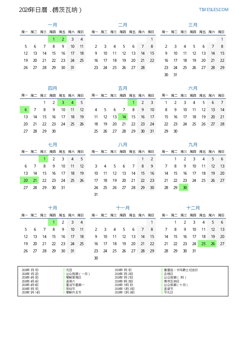 下載並打印2026年博茨瓦纳節假日和周末的PDF日曆