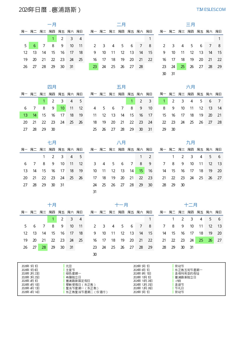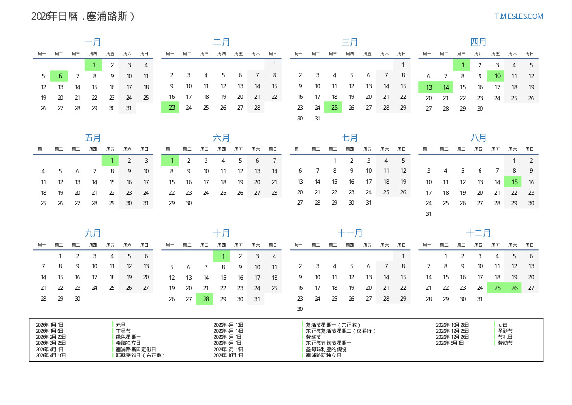 下載並打印2026年塞浦路斯節假日和周末的PDF日曆