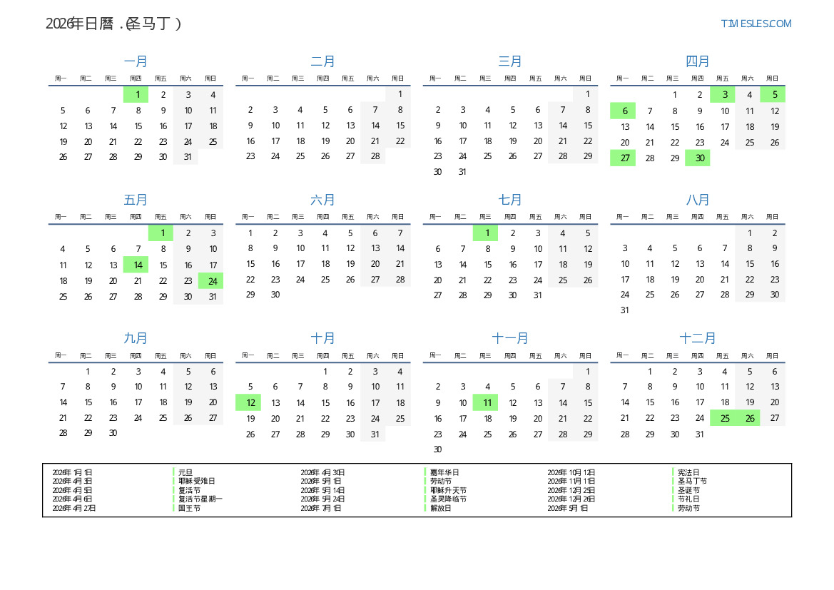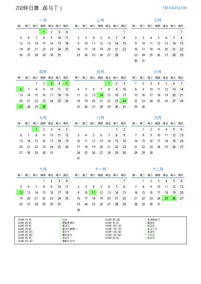陽曆,不是飛躍年,一年365天。 在2026年,2026有19 假期和休假。 在中國東部的日曆上,2026年馬年。 一年從星期四開始,到星期四結束。