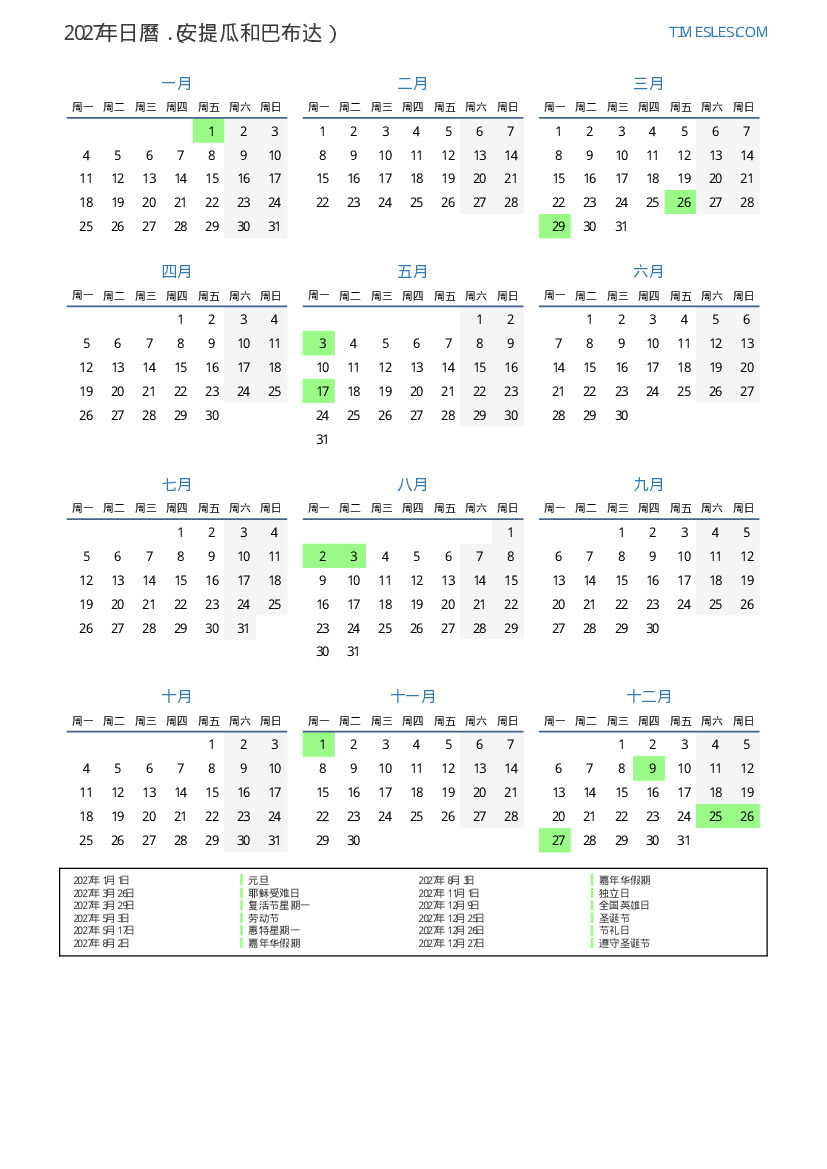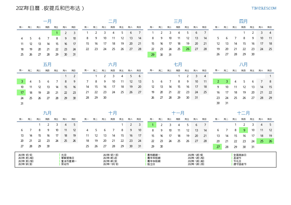 下載並打印2027年安提瓜和巴布达節假日和周末的PDF日曆
