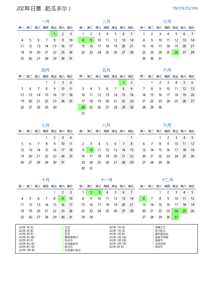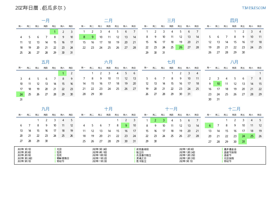 下載並打印2027年厄瓜多尔節假日和周末的PDF日曆