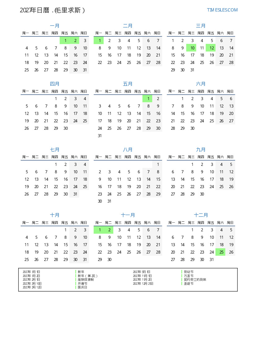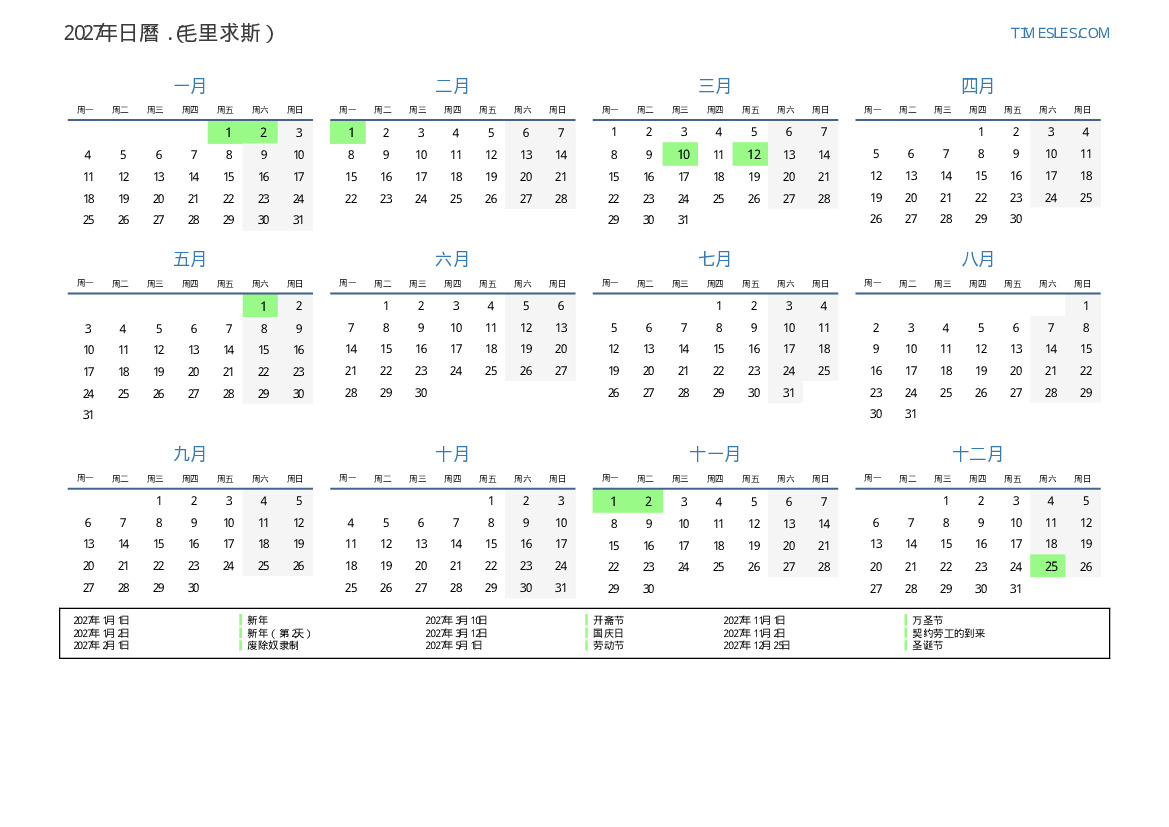 下載並打印2027年毛里求斯節假日和周末的PDF日曆
