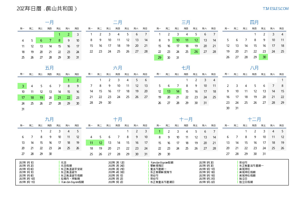 下載並打印2027年黑山共和国節假日和周末的PDF日曆