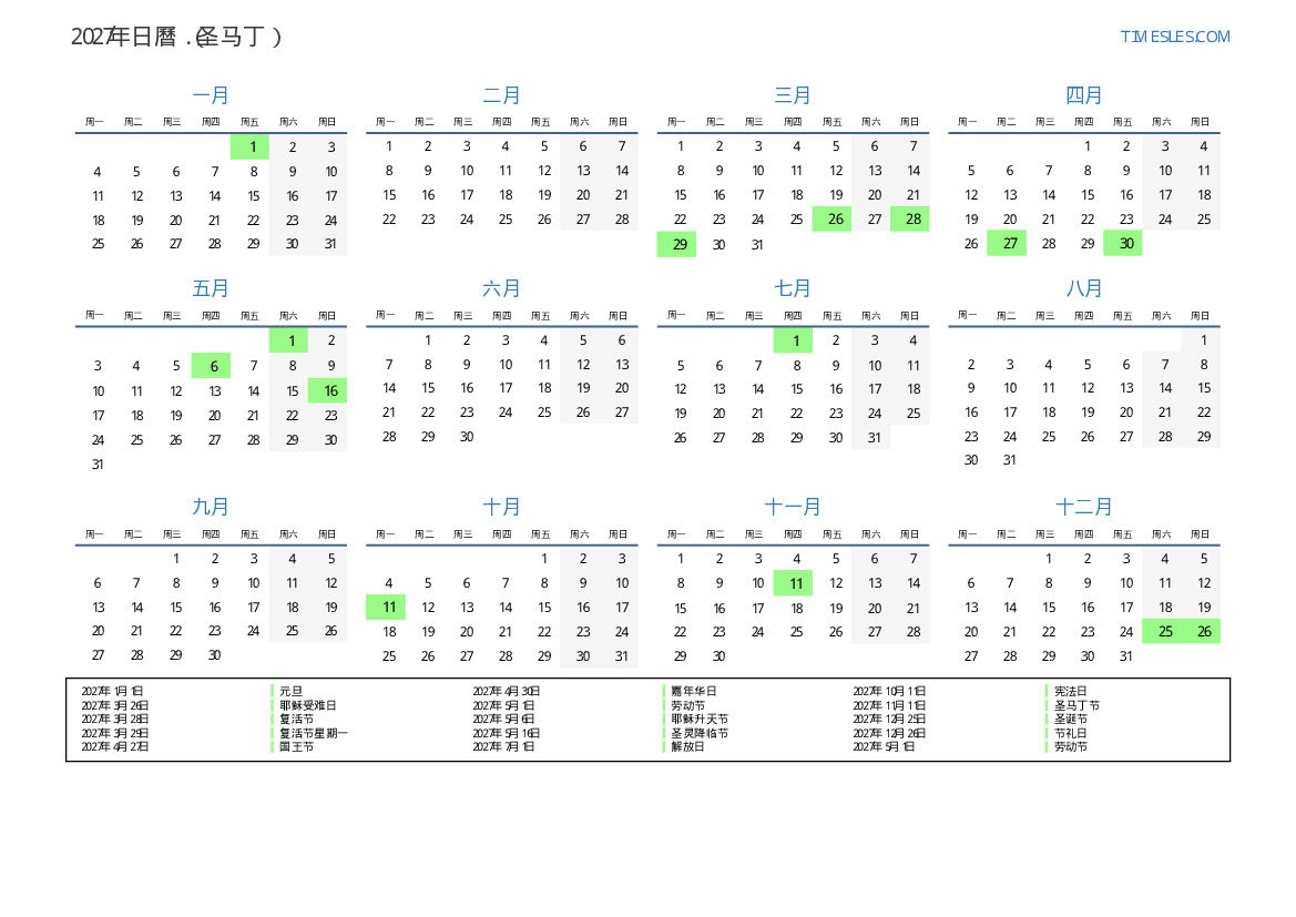 盧薩为圣马丁的2027年假期和周末日曆