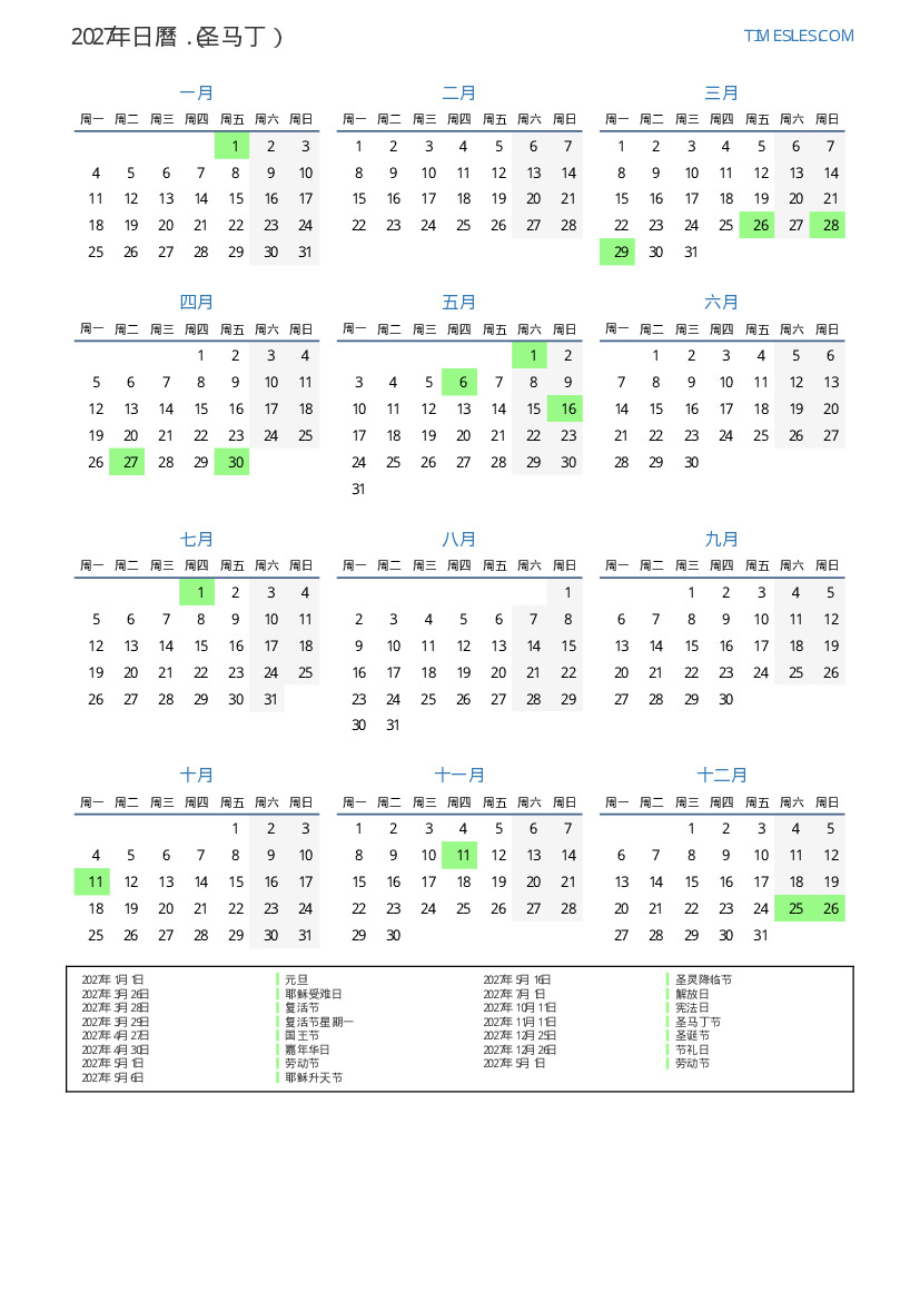 2027年为圣马丁日曆