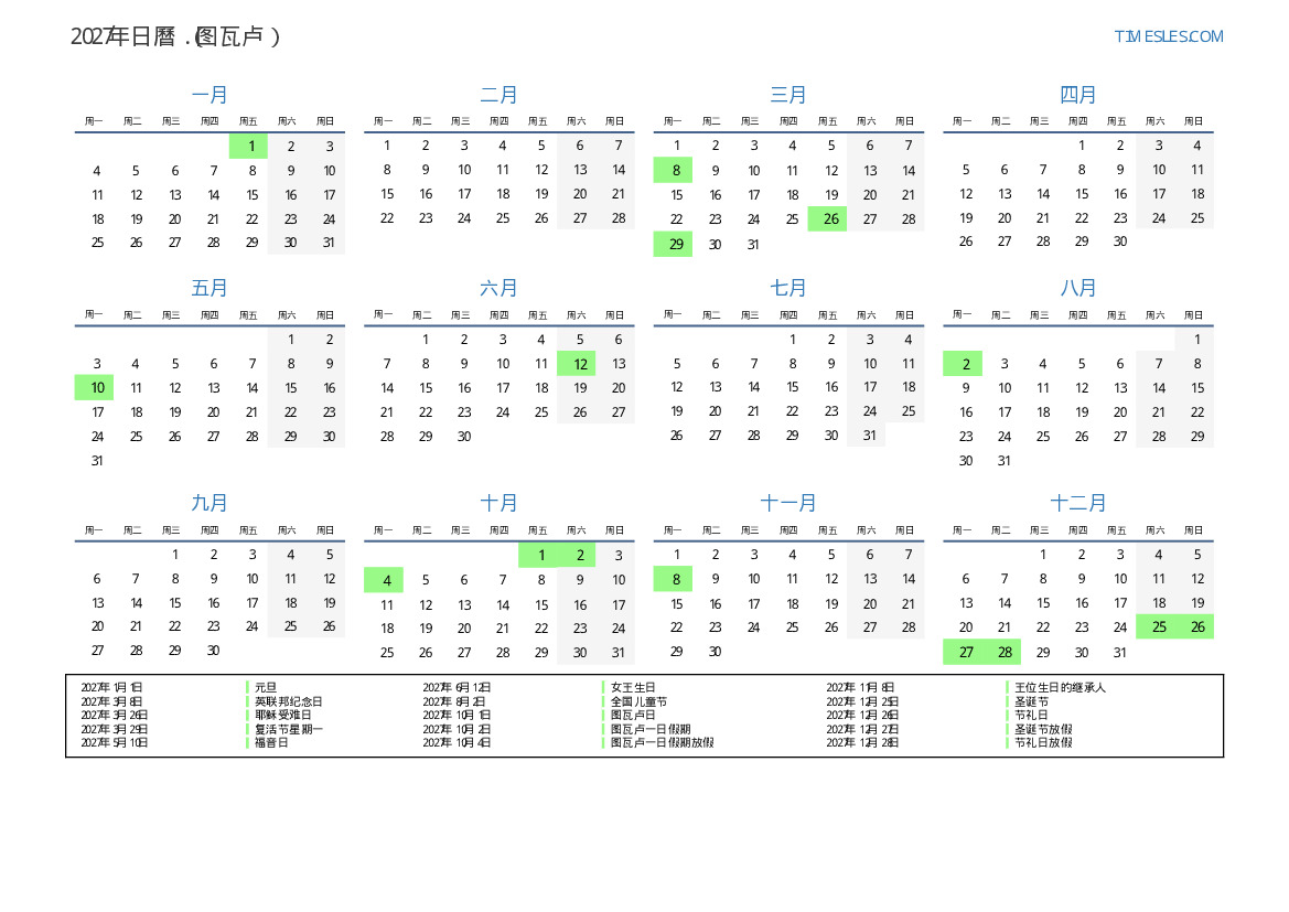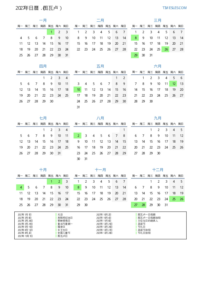 盧薩对于图瓦卢的2027年假期和周末日曆