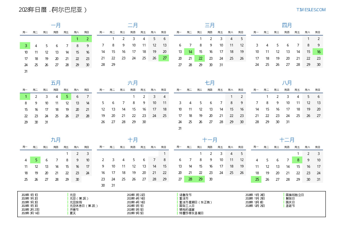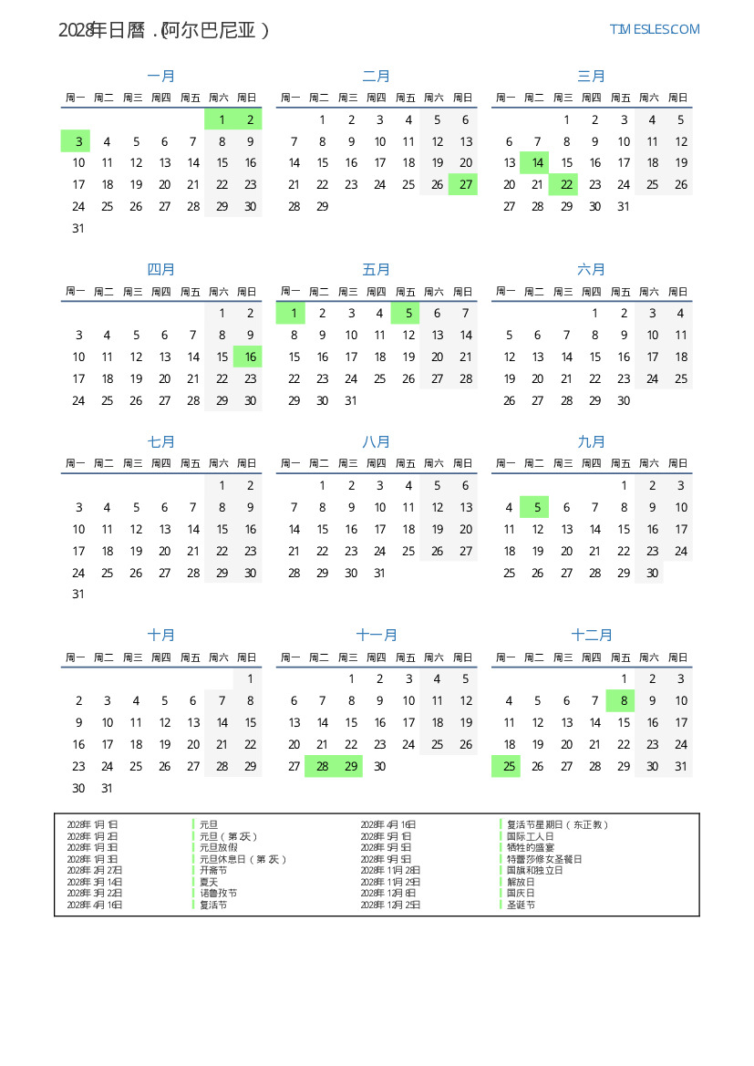 下載並打印2028年阿尔巴尼亚節假日和周末的PDF日曆