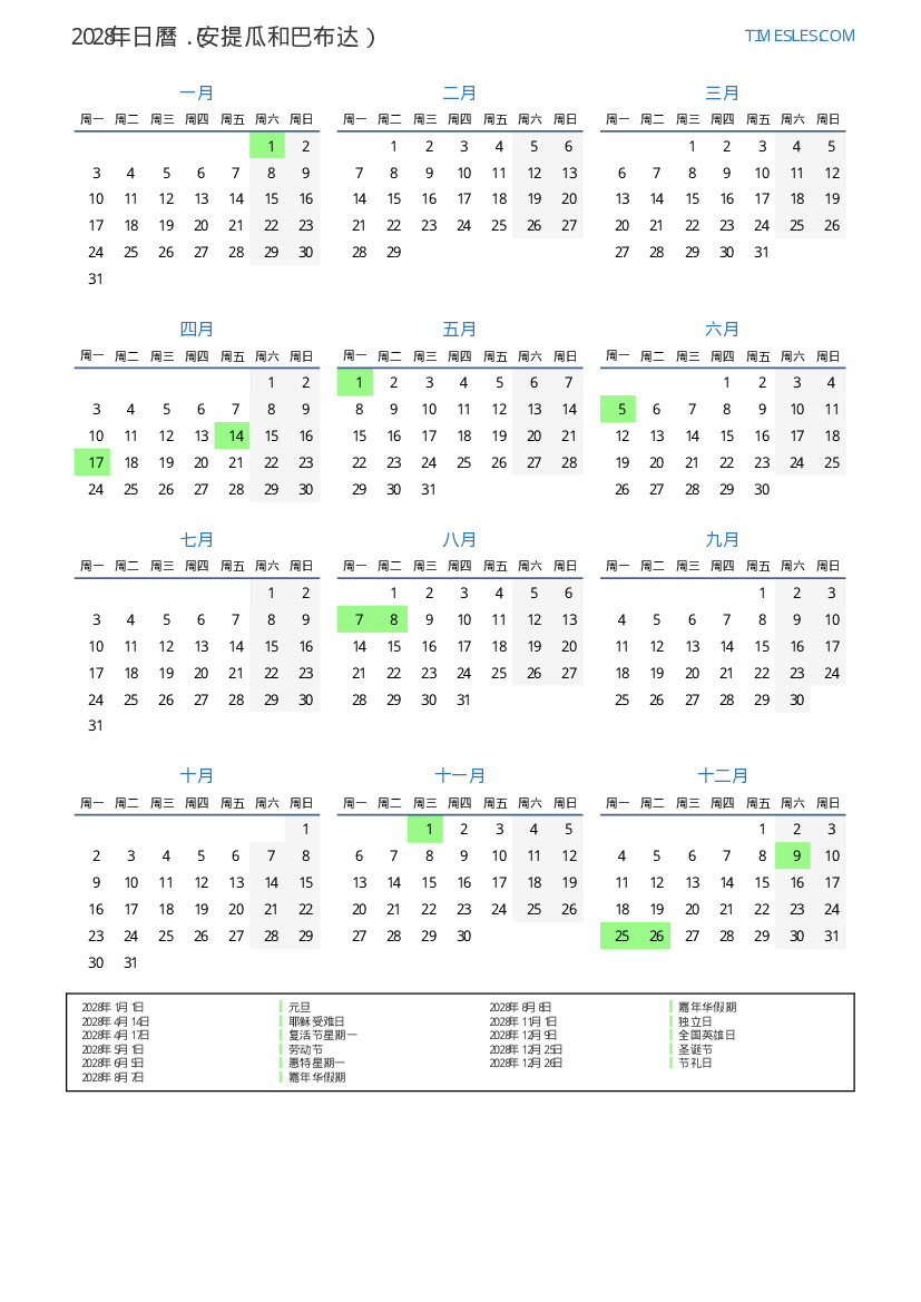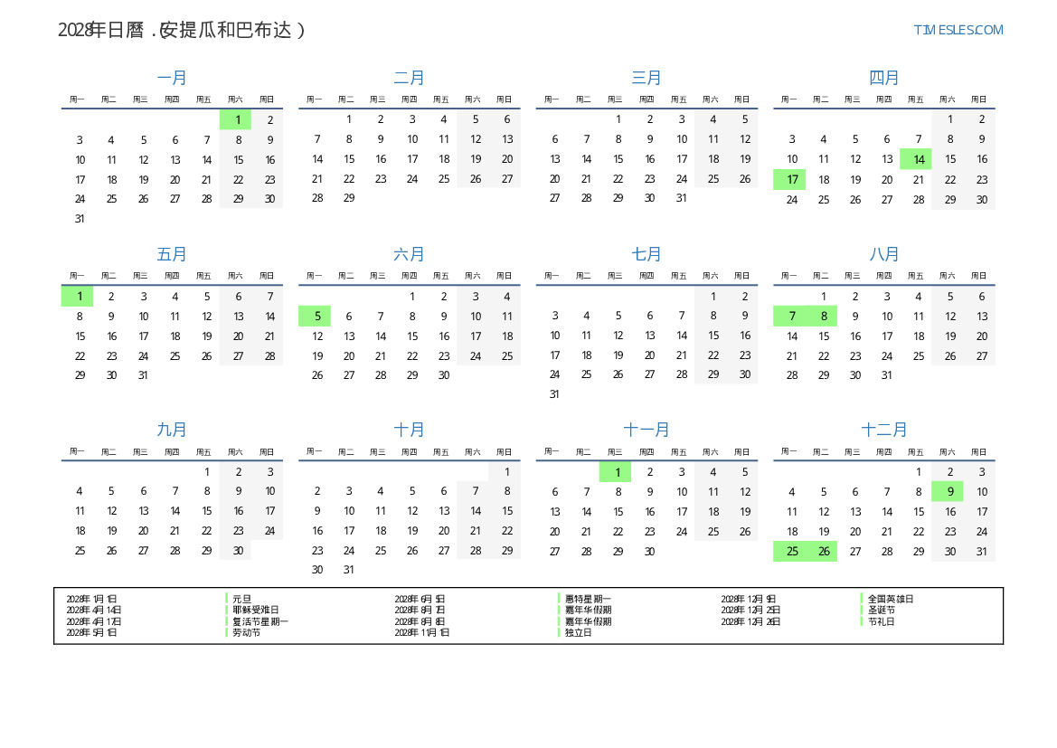 下載並打印2028年安提瓜和巴布达節假日和周末的PDF日曆