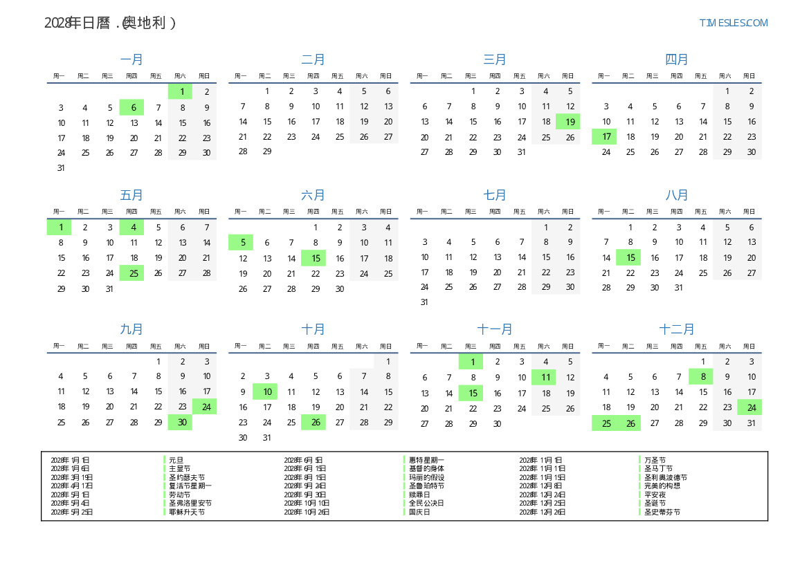 下載並打印2028年奥地利節假日和周末的PDF日曆