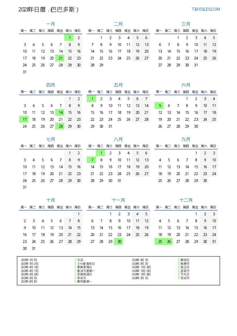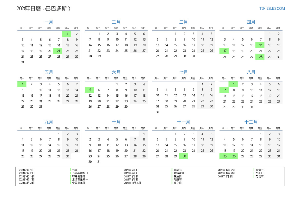 下載並打印2028年巴巴多斯節假日和周末的PDF日曆