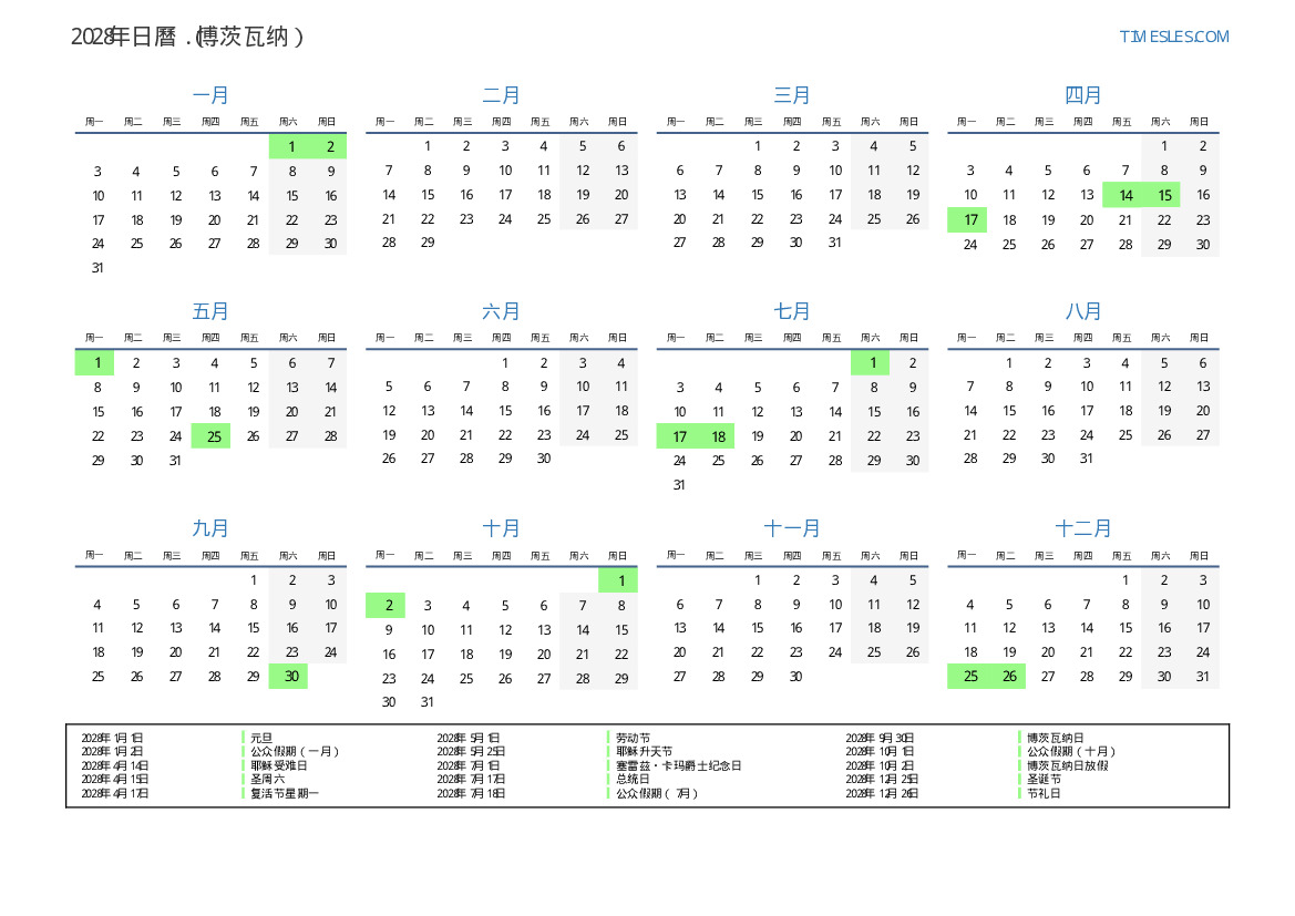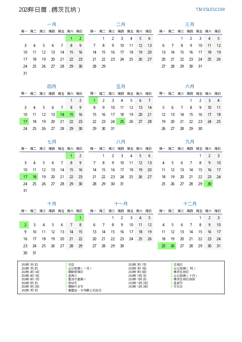 下載並打印2028年博茨瓦纳節假日和周末的PDF日曆