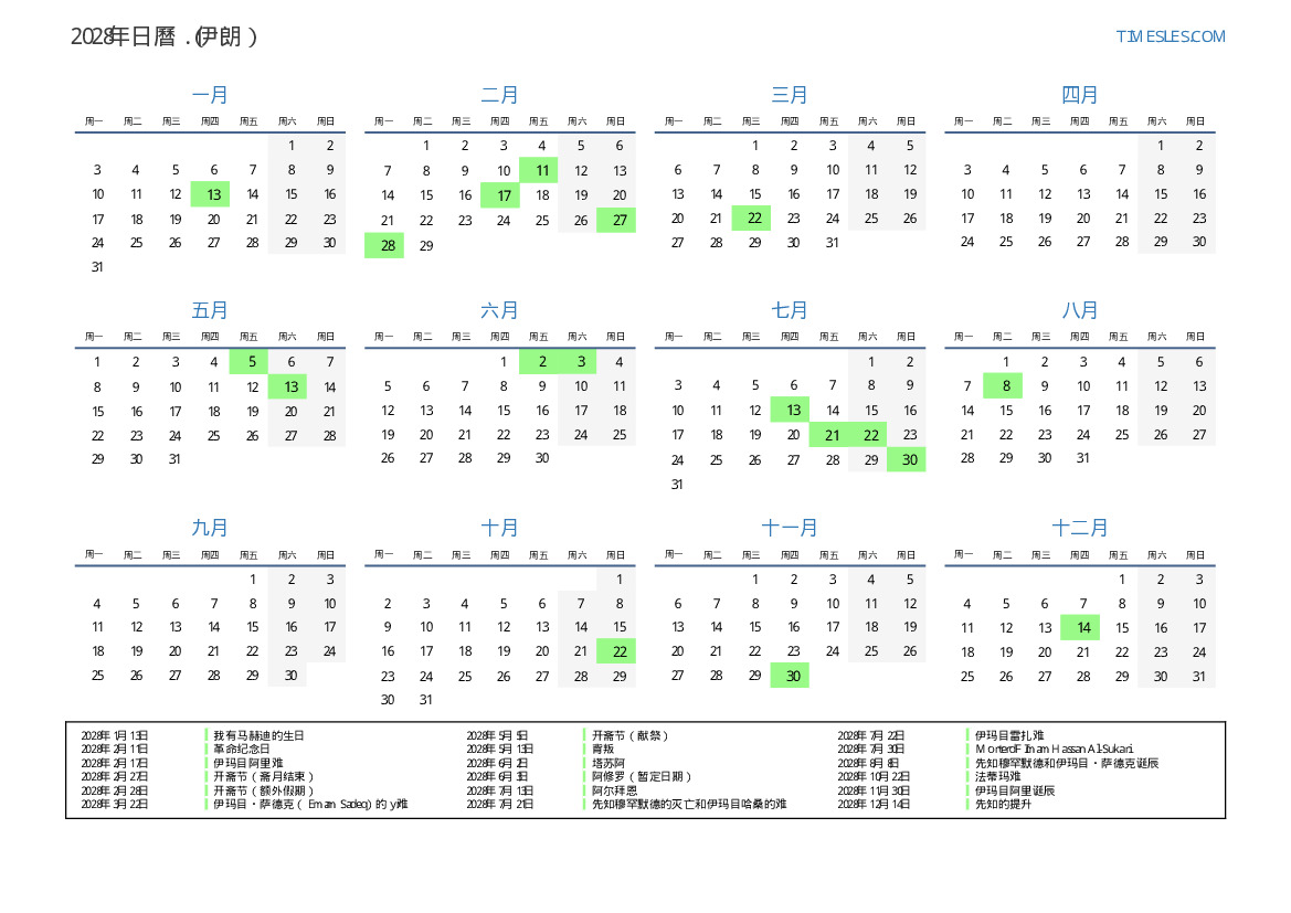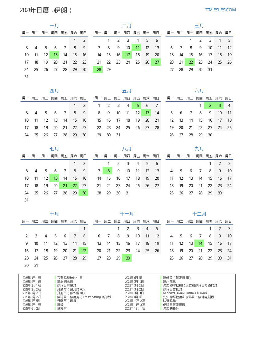 下載並打印2028年伊朗節假日和周末的PDF日曆